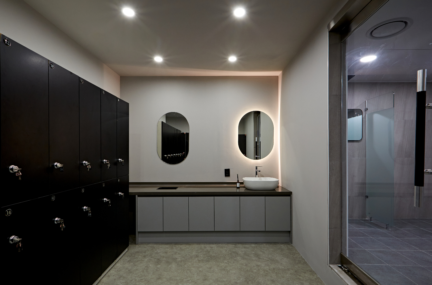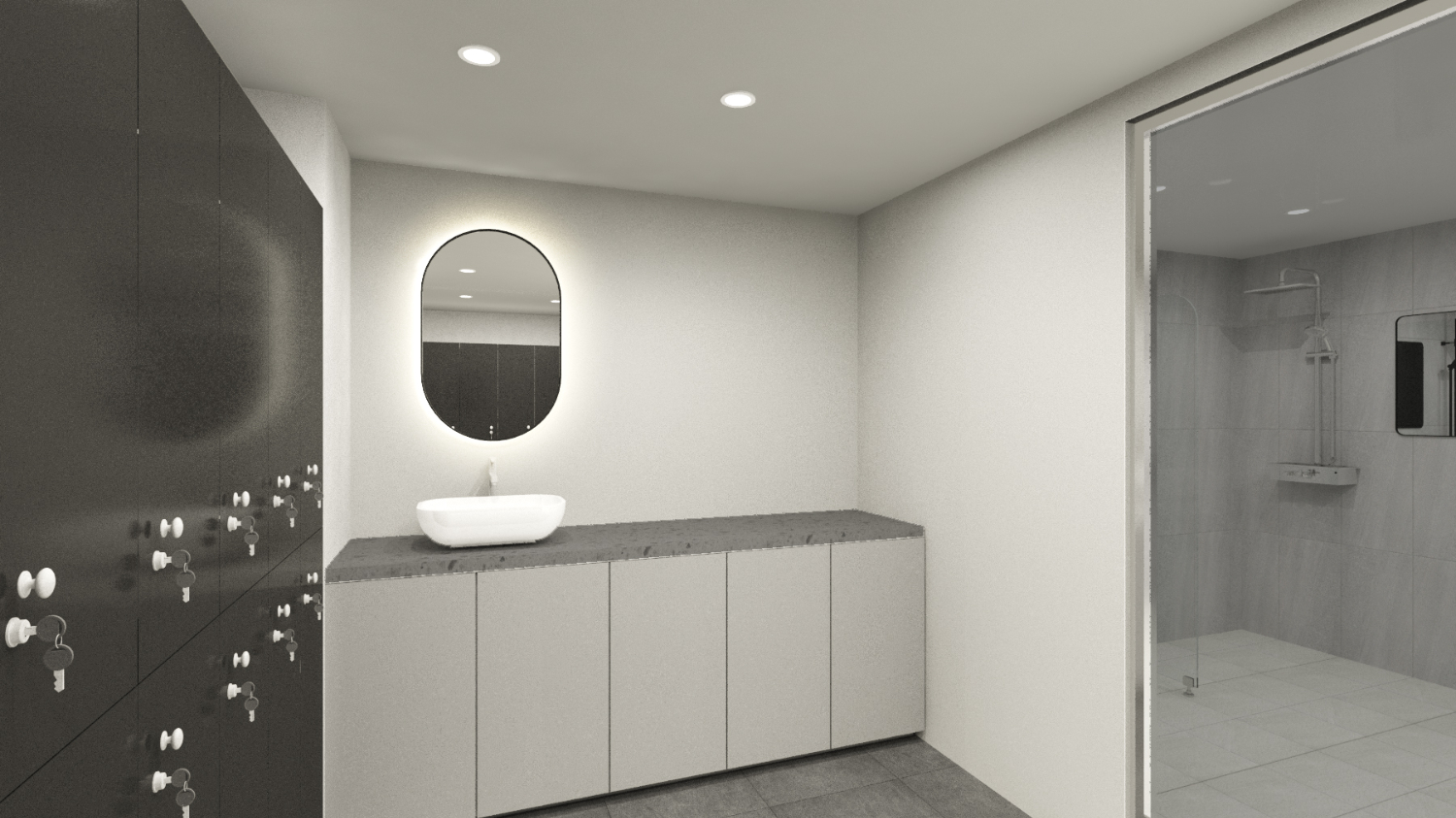 탈의실은 그레이로 통일하지 않고 다른 느낌으로 변주를 주고 싶어하셔서 벽은 화이트로 그리고 바닥은 더 밝은 색상의 질감으로 변경하였습니다. 대신 캐비넷을 블랙으로 선택하여서 외부에서의 느낌과 통일 시켰습니다.
