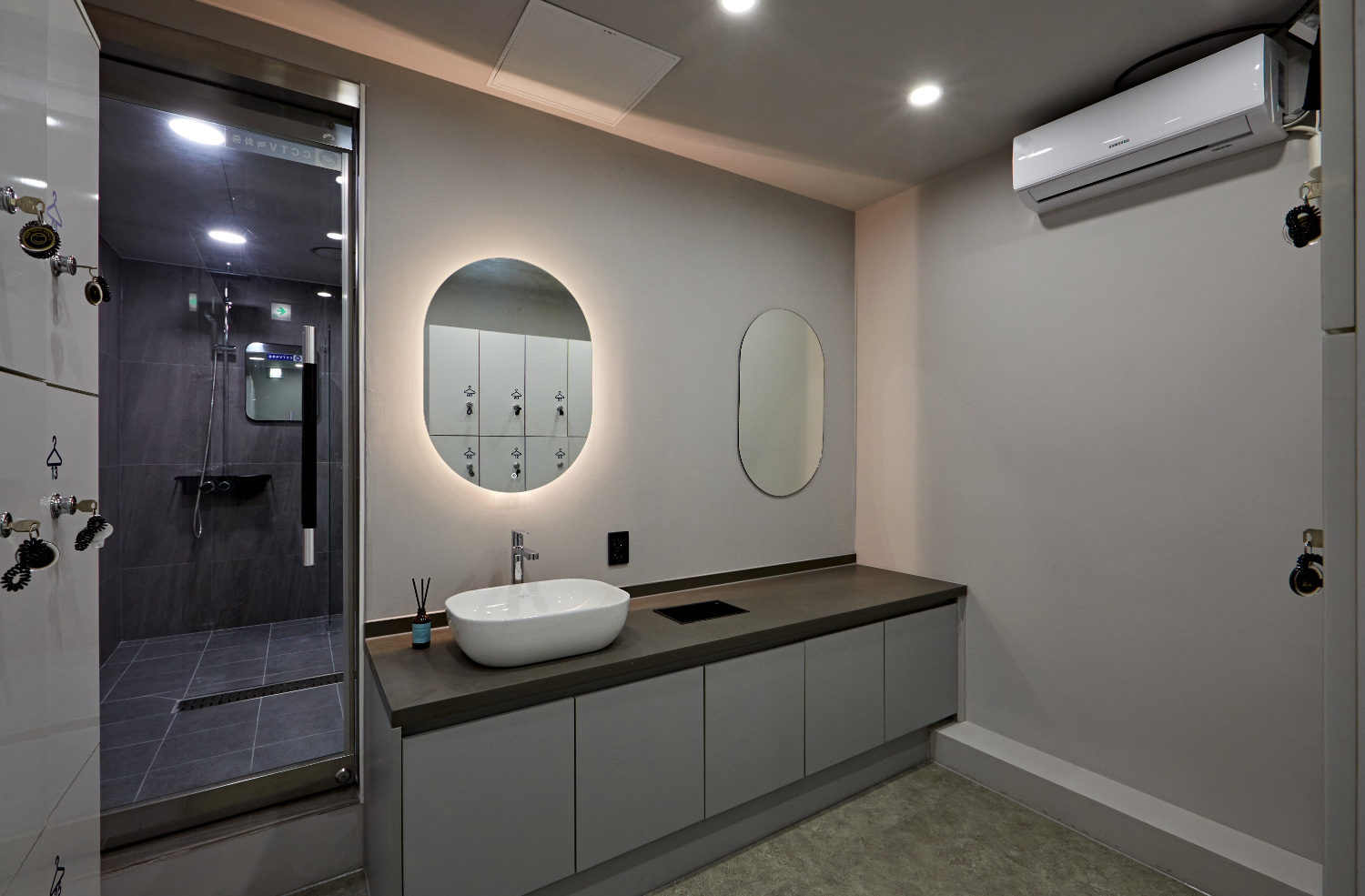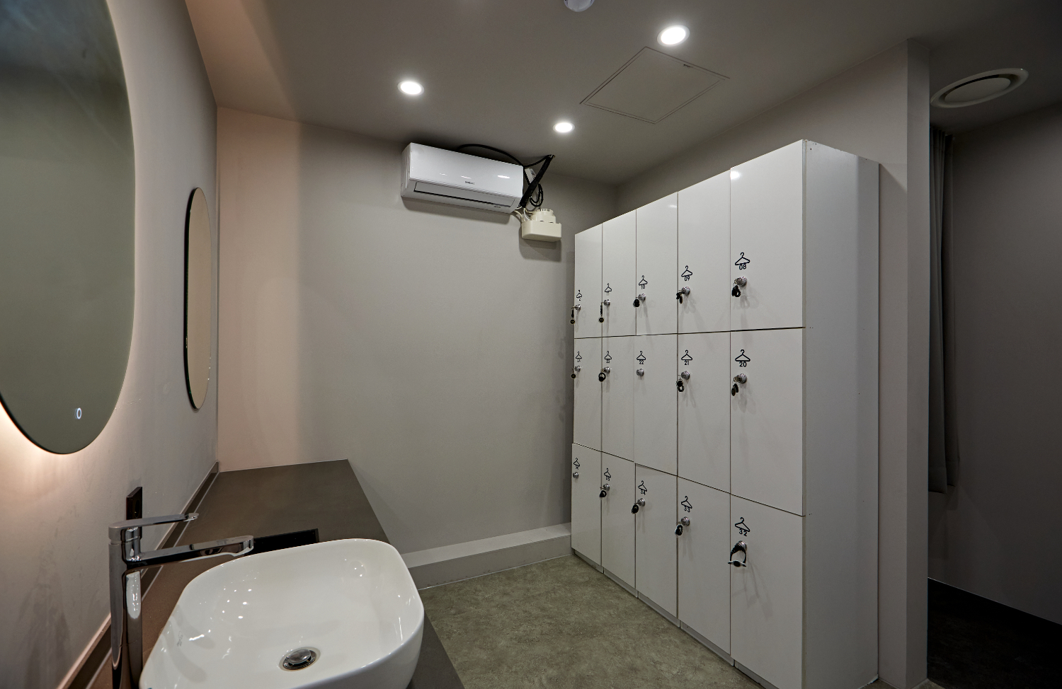 남성 탈의실은 캐비넷수가 많지 않기때문에 화이트로 깔끔함을 강조하였고 심플한 화장대로 따뜻한 이미지를 주었는데요.