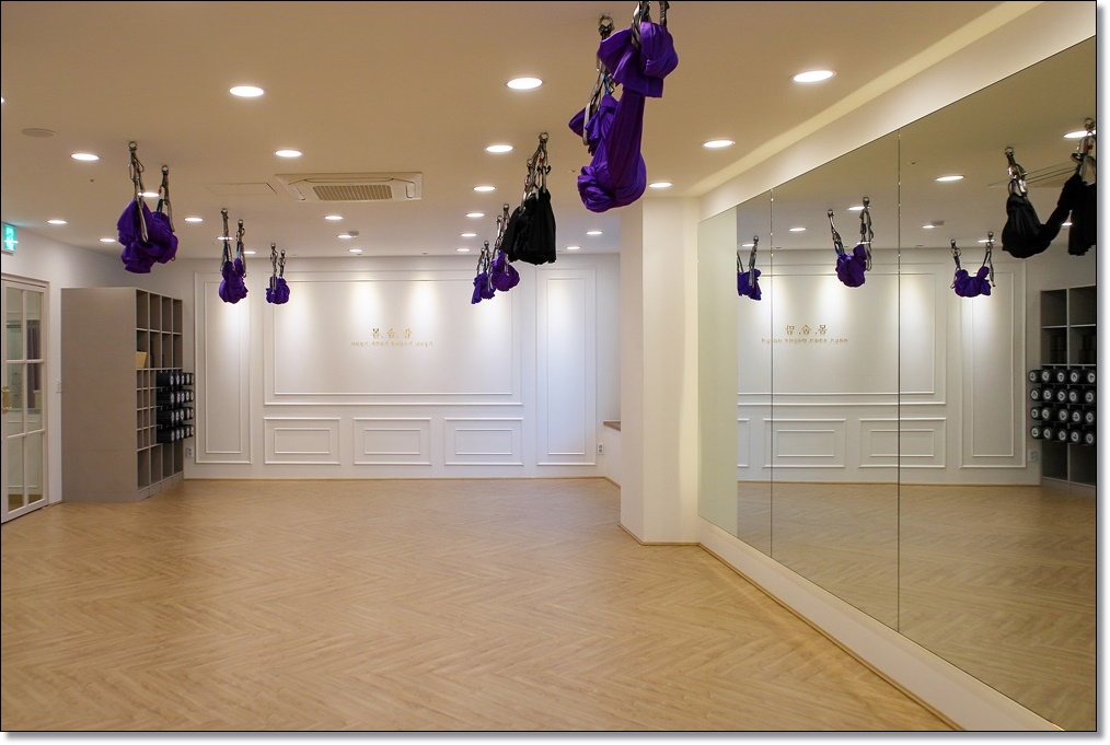 천장에는 플라잉 요가를 위한 설치물을 달았는데요, 동작 범위가 넓은 점을 감안해 서로 간섭하지 않는 간격으로 견고하게 시공했습니다. 벽면에는 우드 소재의 걸이와 수납장을 시공해 아늑한 공간이 더욱 따스한 느낌이 들고 했는데요, 합판으로 만든 요가 매트 수납공간이 이 곳의 정체성을 보여주면서 세련된 인테리어를 완성하고 있네요.