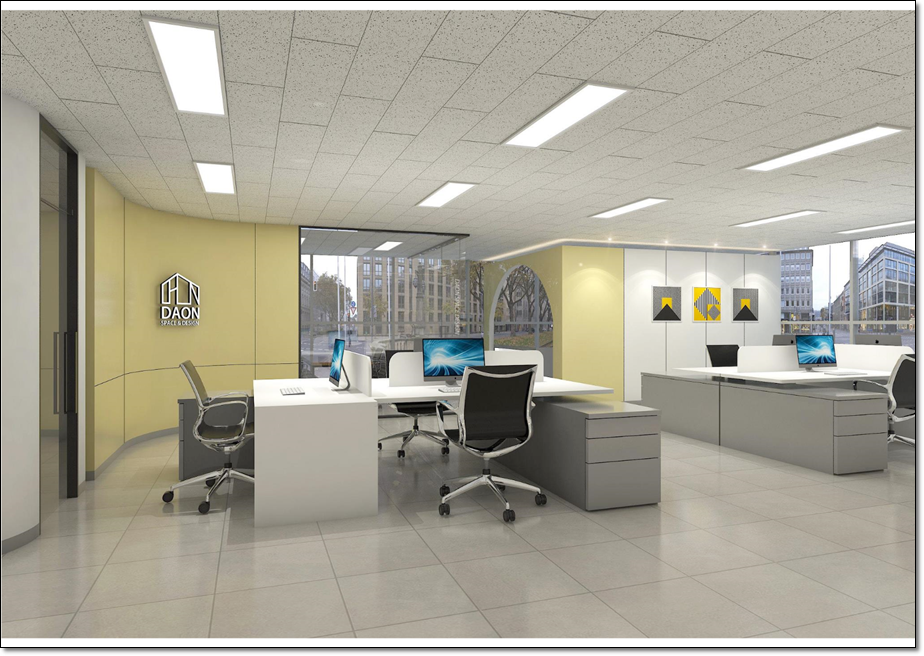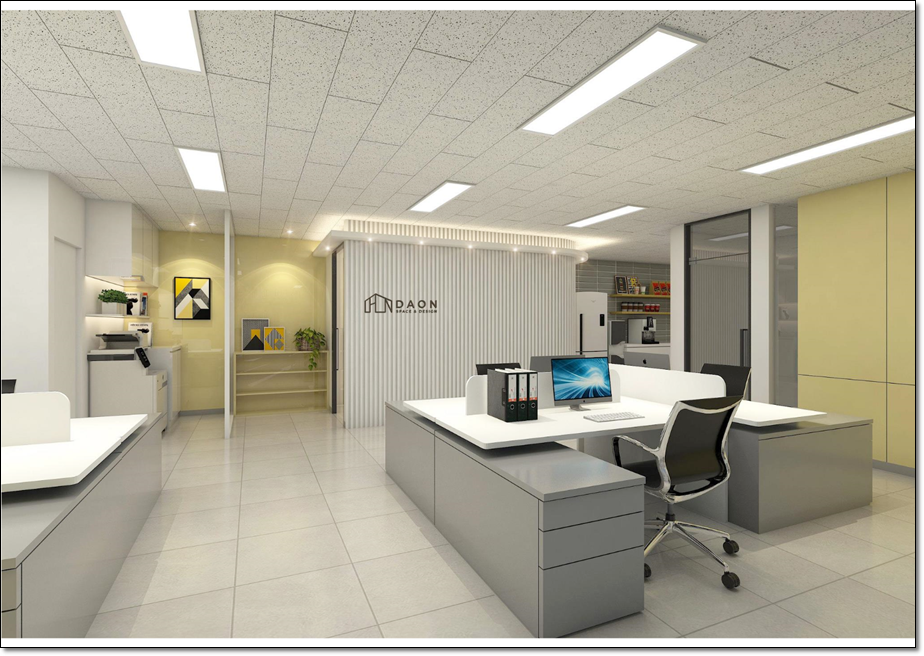 책상 뒷벽은 상하부로 디자인을 분리했고 하부에는 수납장을 계획하면 다른 가구를 배치하지 않고 심플한 인테리어를 유지하는 동시에 수납력을 높일 수 있습니다. 상부와 하부 중간은 타공해 간접조명을 시공하면 고급스러운 분위기를 조성할 수 있고 벽면에 로고와 업체명을 넣으면 포인트가 되면서 임팩트를 줄 수 있겠죠.