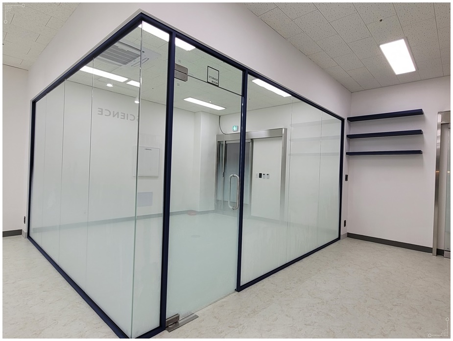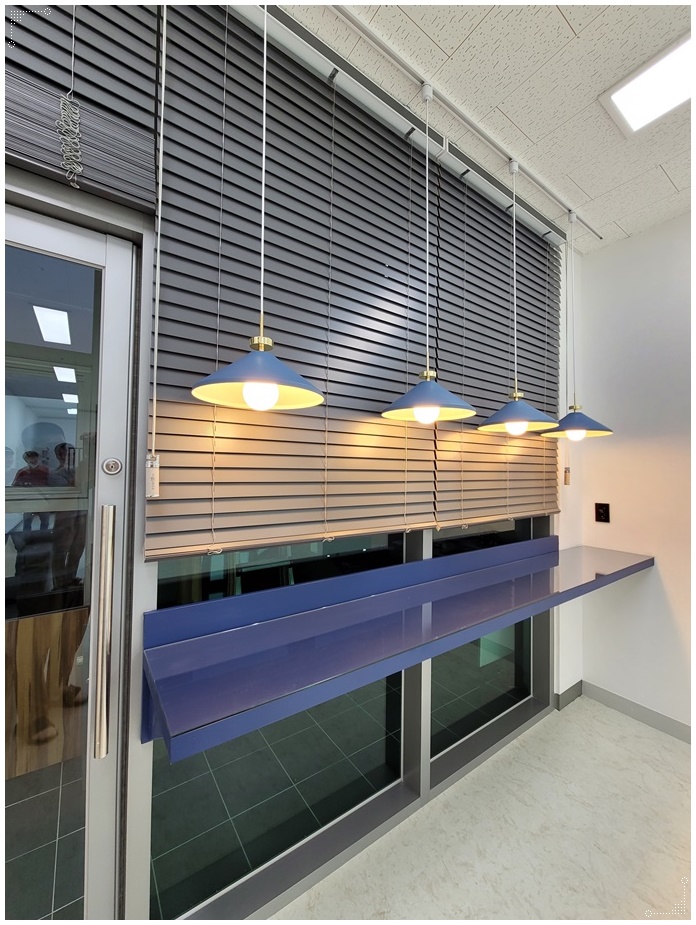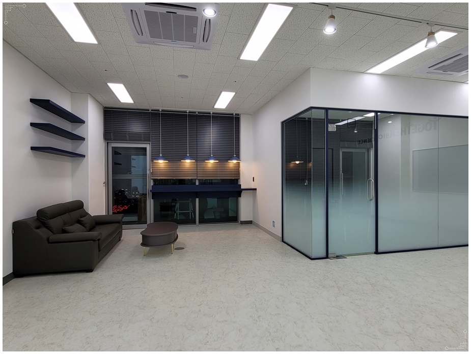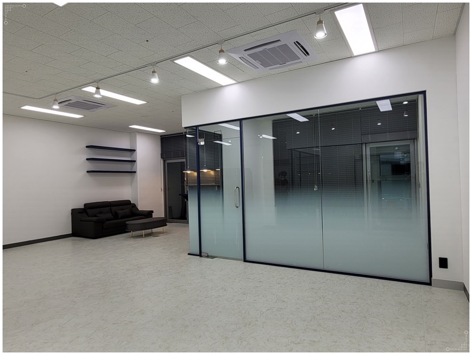 독립적 개별 공간은 블랙 프레임의 유리 가벽을 시공해 분리했습니다. 투명한 유리 가벽은 개방성, 연장성, 확장성의 장점이 있어 공간을 넓어 보이게 하지만 너무 직접적인 노출이 부담스러울 수 있기 때문에 하단부나 가운데에 시트지 시공을 적용하면 프라이버시를 확보할 수 있습니다.