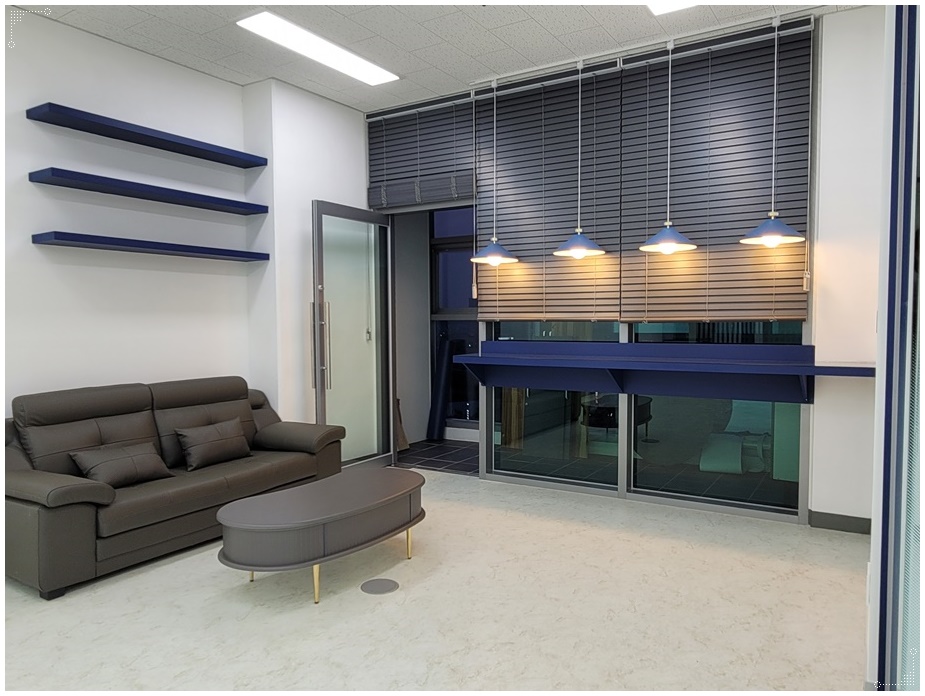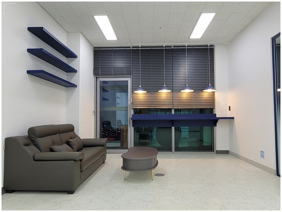 손님을 응대하거나 직원이 잠시 쉴 수 있는 휴게공간은 자연광을 만끽할 수 있는 전면창측에 배치해 쾌적하고 편안하게 쉴 수 있도록 했습니다. 오픈형 공간이긴 하지만 진한 컬러의 소파, 포인트 컬러, 팬던트 조명, 무지주 선반 등의 이색적인 인테리어를 적용해 같은 사무실이지만 다른 분위기의 공간임을 명확하게 보여주고 있네요.