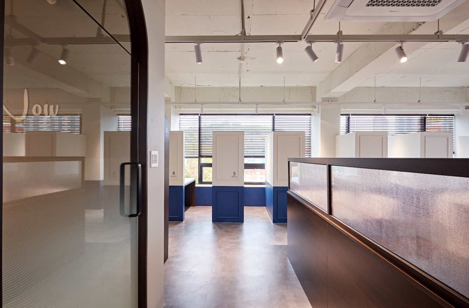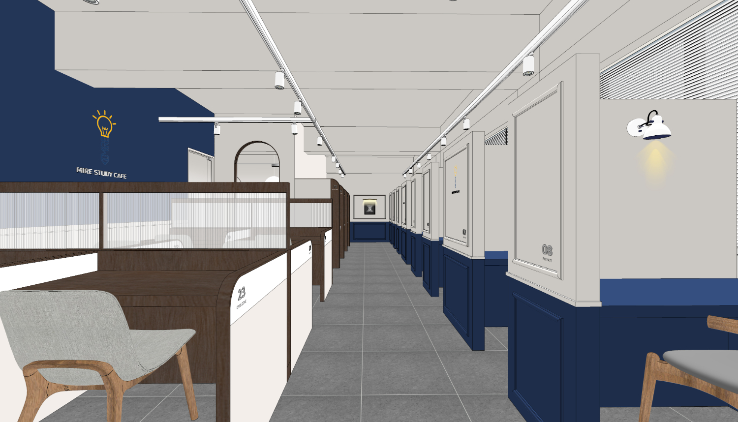 모든 파티션의 높이가 높지 않아서 답답하지 않으면서도 앉아있으면 외부와의 시야를 차단해 집중도를 높일 수 있습니다. 레일 조명을 제안드렸으며 메인 컬러인 네이비와 조화를 이룰 수 있는 그레이, 화이트, 우드재질을 사용하였습니다.
