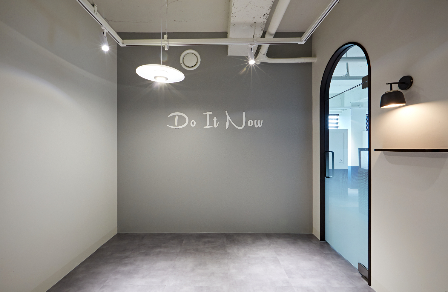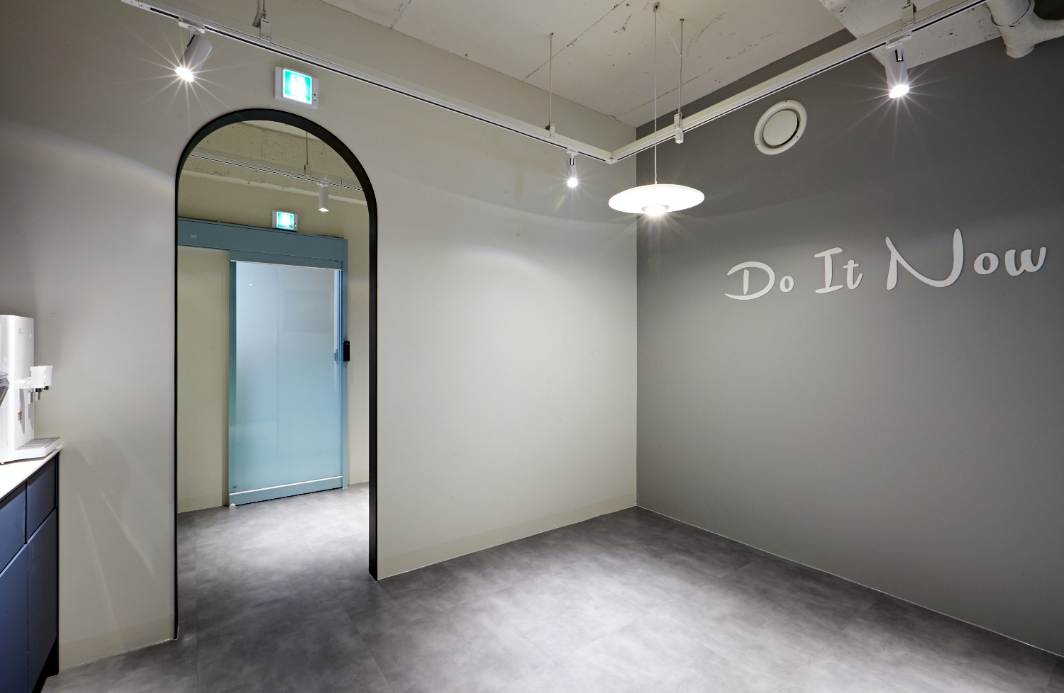 카페테리아 공간의 한 쪽 벽면에는 매트한 그레이로 도장하여 힘을 낼 수 있는 문구를 양각으로 새겨넣었습니다. 세련되면서도 심플한 포인트가 되었고, 천장의 레일 조명은 공간을 더욱 미니멀하게 만들어주었는데요.