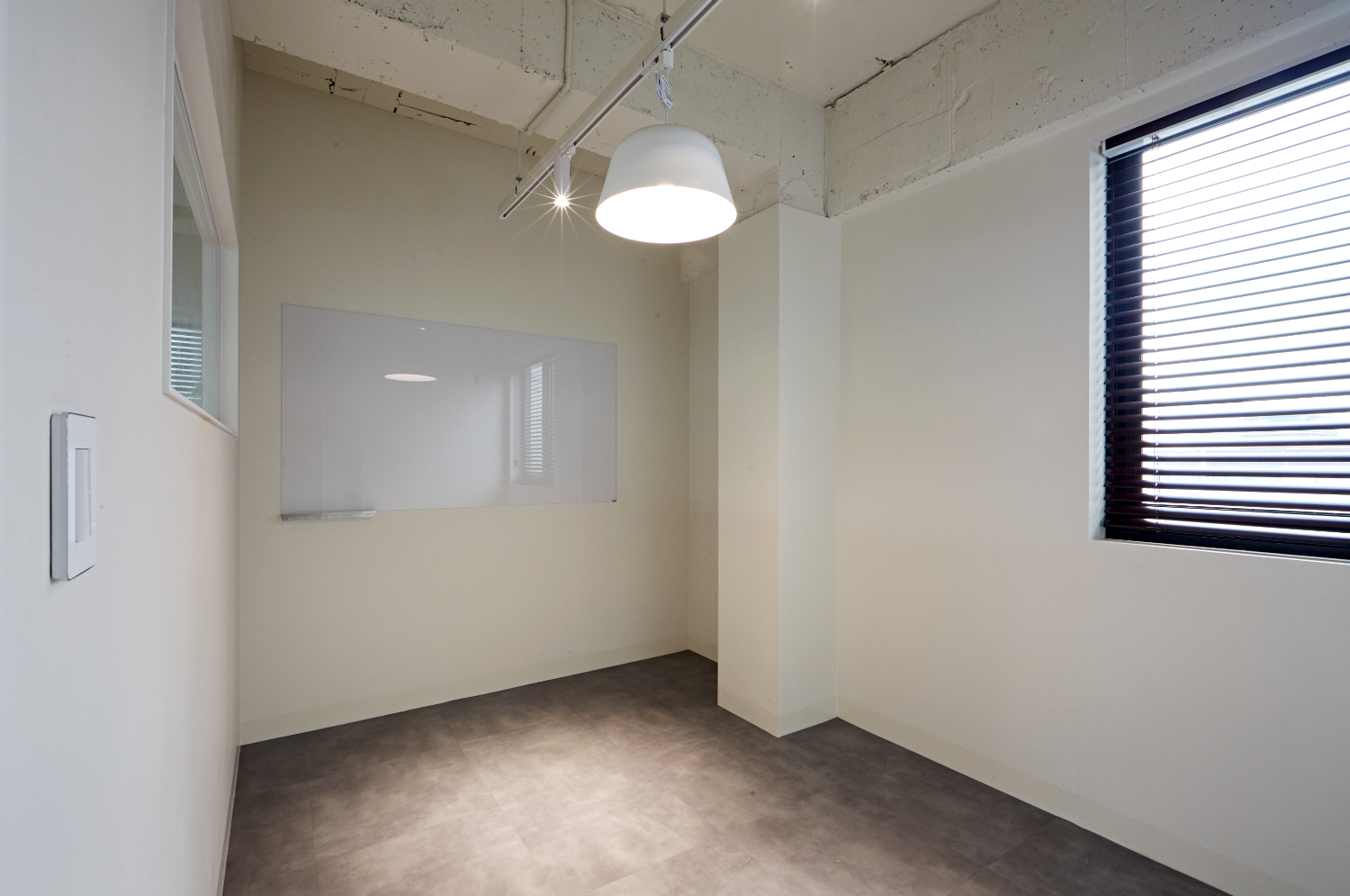 또한 포천 동두천 양주 학원인테리어의 룸을 살펴보면 화이트보드가 벽에 부착 되어 있어 편안한 수업과 미팅을 진행할 수 있습니다. 학생들끼리의 스터디 모임을 주관할 수 있는데요. 자그마한 룸이라서 자칫 좁다고 느껴질 수 있지만 전체 화이트로 시공하면서 천장을 노출하여 천고를 높였습니다. 그리고 벽과 도어에도 유리로 타공이 되어있어 오히려 개방감을 높여줍니다.