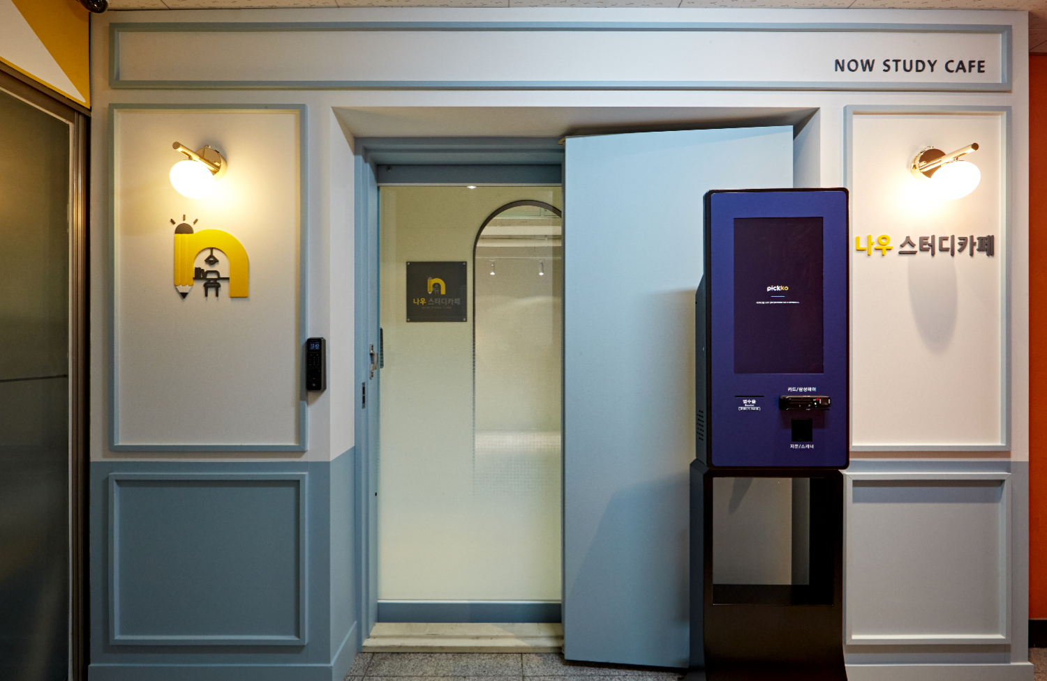 포천 동두천 양주 학원인테리어의 입구 모습입니다. 대칭되는 이미지는 깔끔한 분위기를 연출해주고 전체를 파란색 계열로 통일하였습니다. 그래서 더욱 마음의 안정감을 주고 있는데요. 아이들이 활용하는 곳인만큼 노란색 포인트를 주었고 벽등으로 클래식한 분위기를 높였습니다.