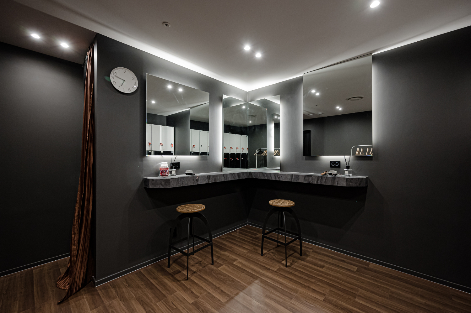 필라테스인테리어 하면 밝은 분위기의 화이트 인테리어가 대부분이지만 이번 현장은 고급스러운 하이 브랜드가 컨셉인만큼 월넛과 블랙 컬러를 메인으로 사용했습니다. 관련 업종에서는 찾아보기 어려운 특색 있는 컨셉이지만 무난한 컬러와 소재를 사용하여 이질감 없이 조화로운 디자인입니다.