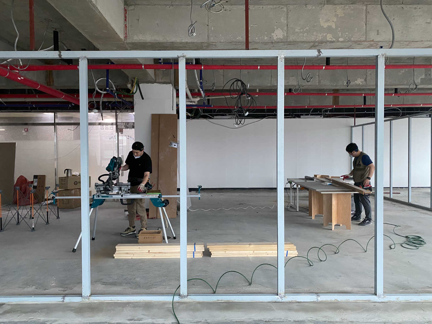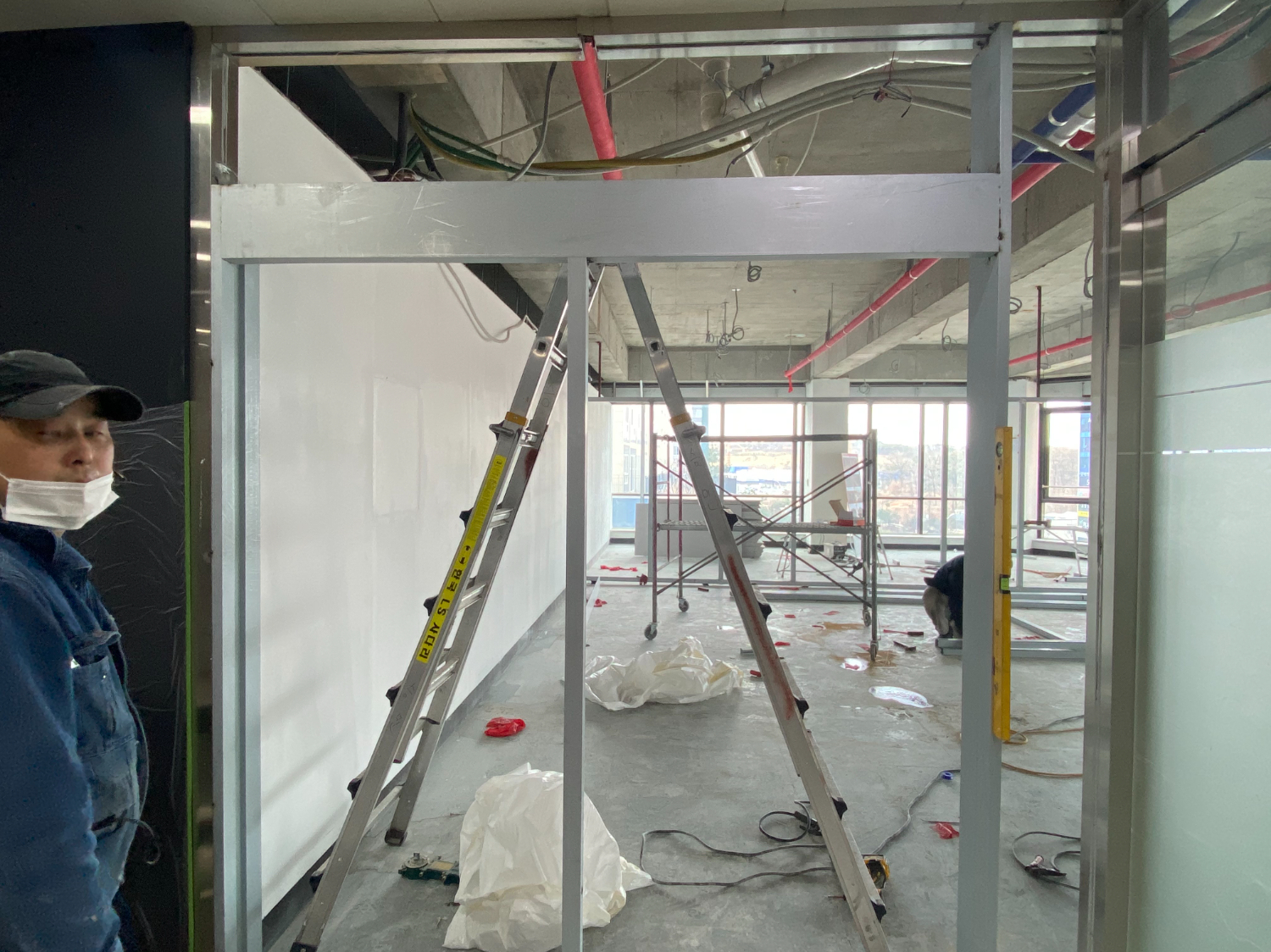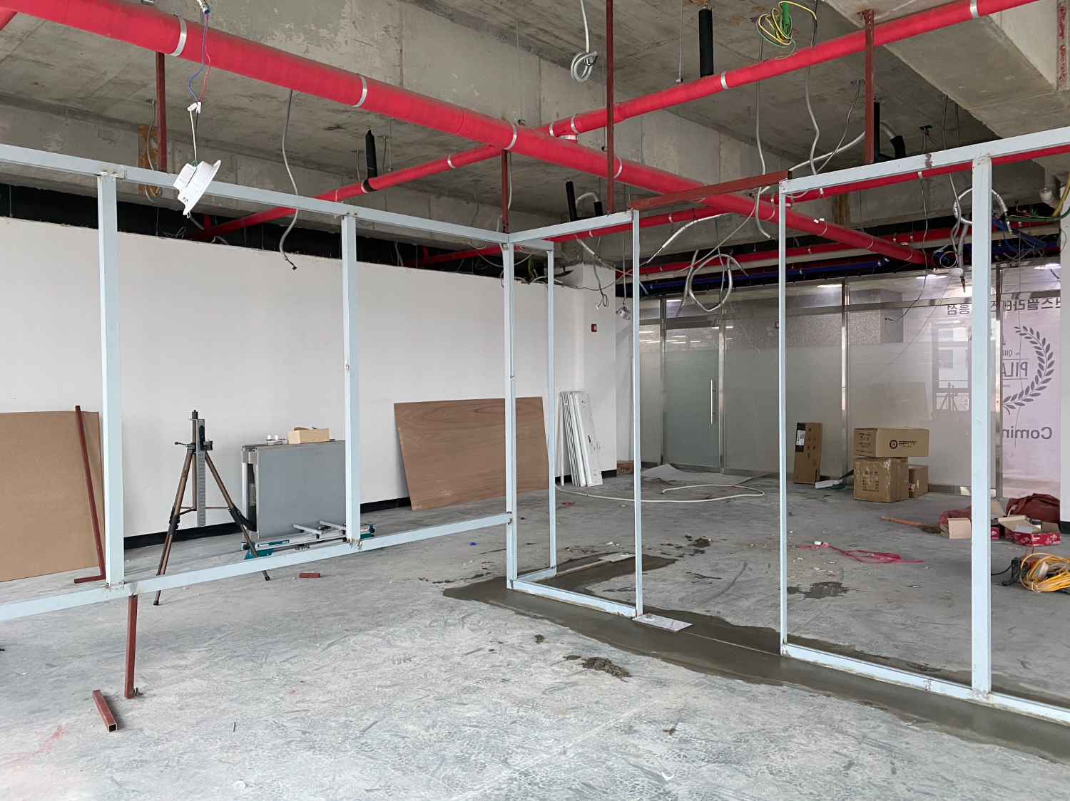 그 다음은 새로운 공간의 뼈대를 만들어주는 철골 작업입니다. 공간 구분은 목공 작업으로 진행을 하는경우도 있으나 이번 현장은 벽면을 글라스월로 설치할 예정이라 철골도 같이 사용 했습니다.