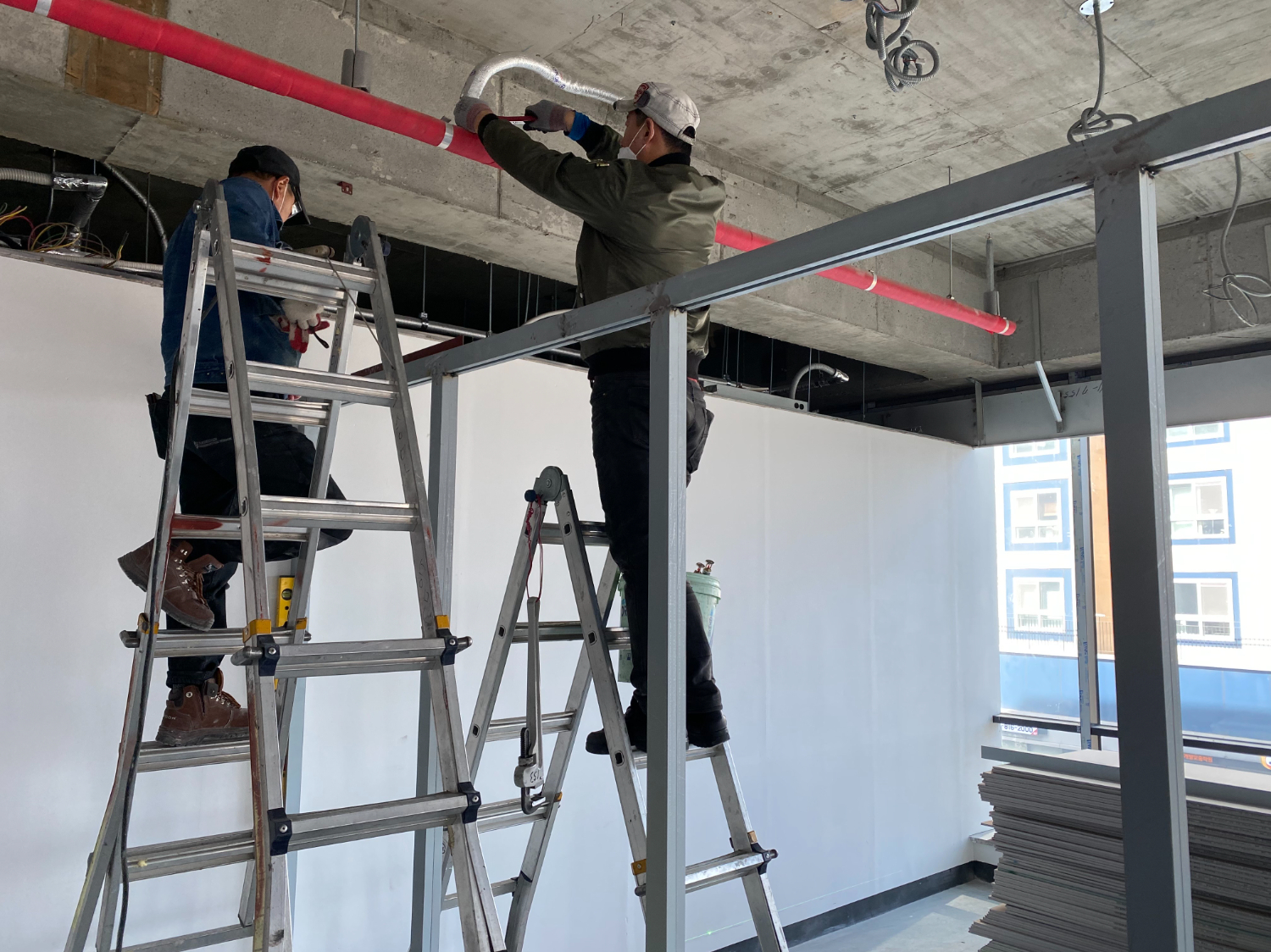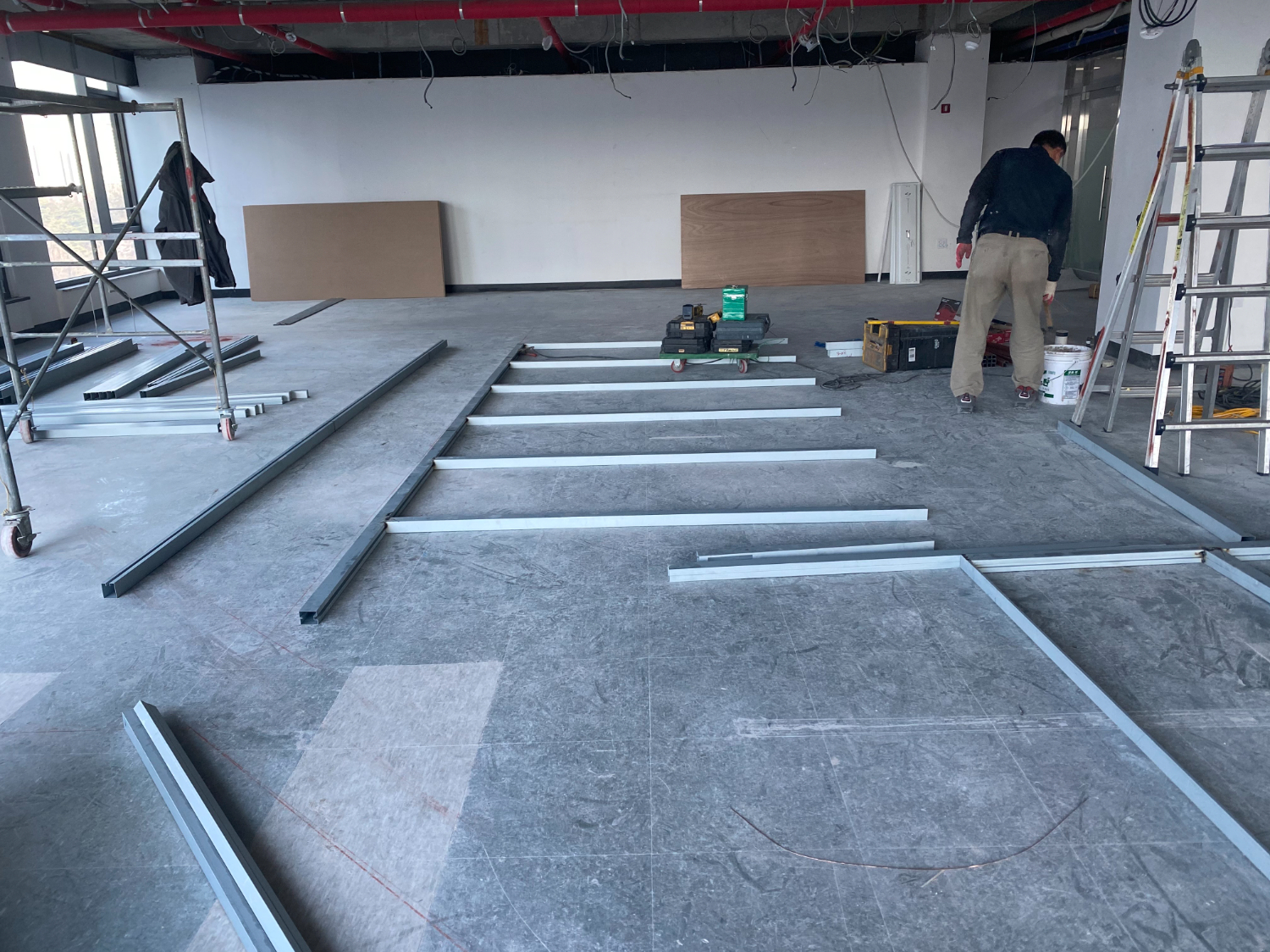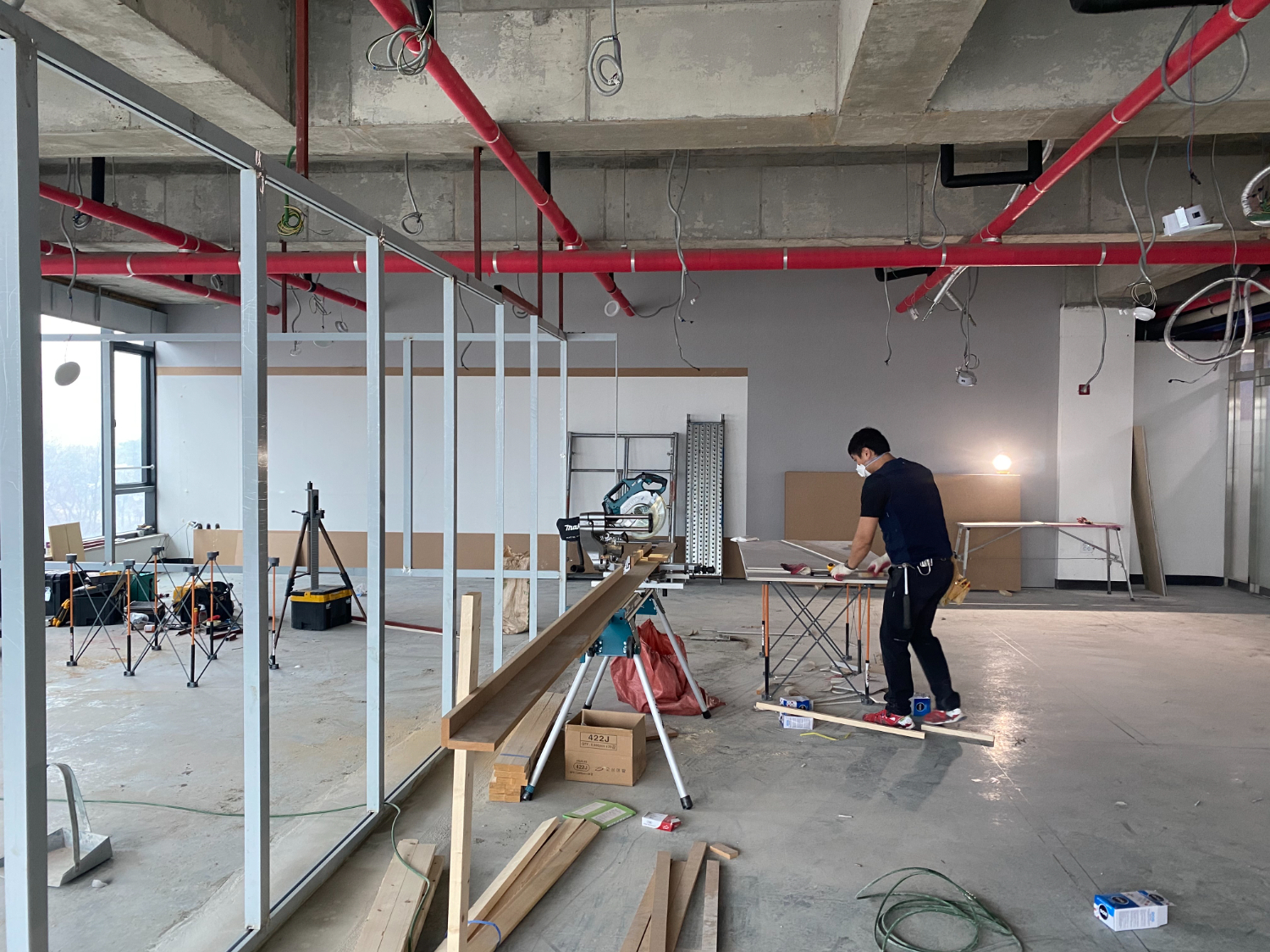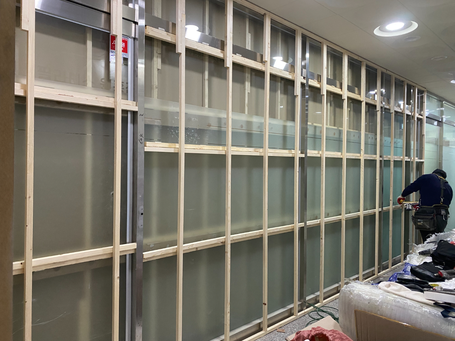 그 다음은 새로운 공간의 뼈대를 만들어주는 철골 작업입니다. 공간 구분은 목공 작업으로 진행을 하는경우도 있으나 이번 현장은 벽면을 글라스월로 설치할 예정이라 철골도 같이 사용 했습니다.