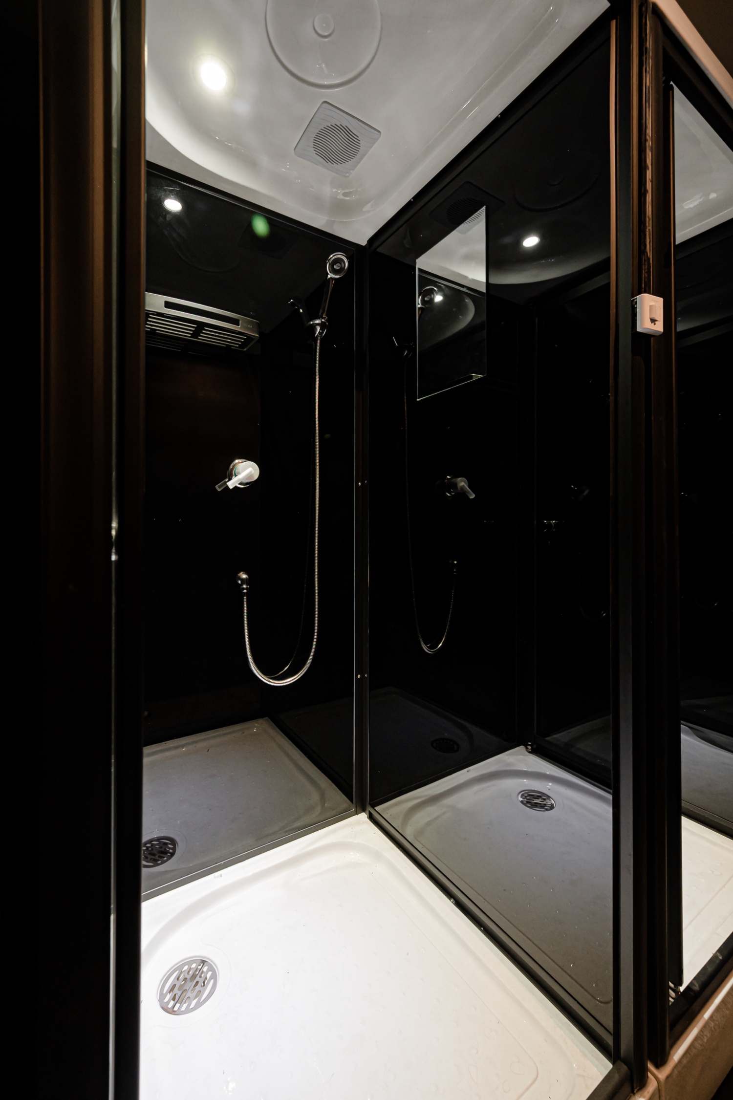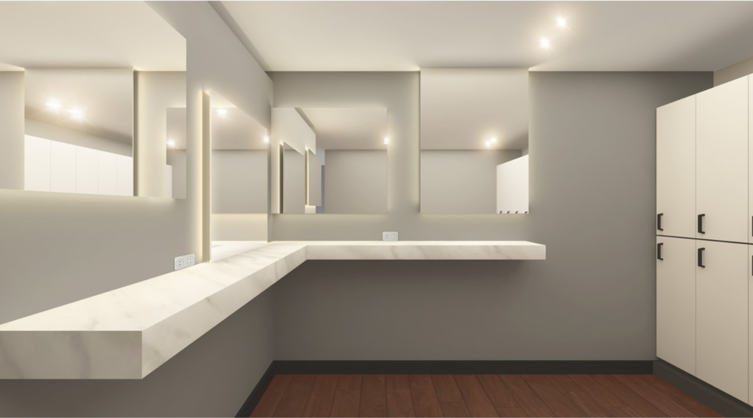 탈의실과 샤워실은 화이트 컬러를 추가하여 내부 인테리어 보다 밝은 분위기로 구성을 했습니다. 깔끔한 느낌을 주기 위해 천장도 마감을 하였고 매립등과 간접등은 백광색 컬러를 사용 했습니다. 샤워실에는 1인 샤워부스를 설치하여 프라이빗함을 더해주었습니다.