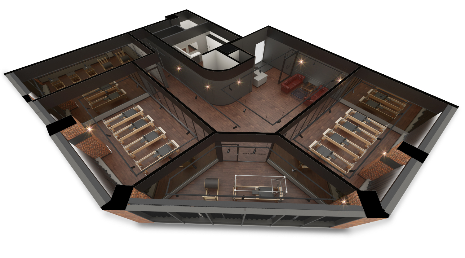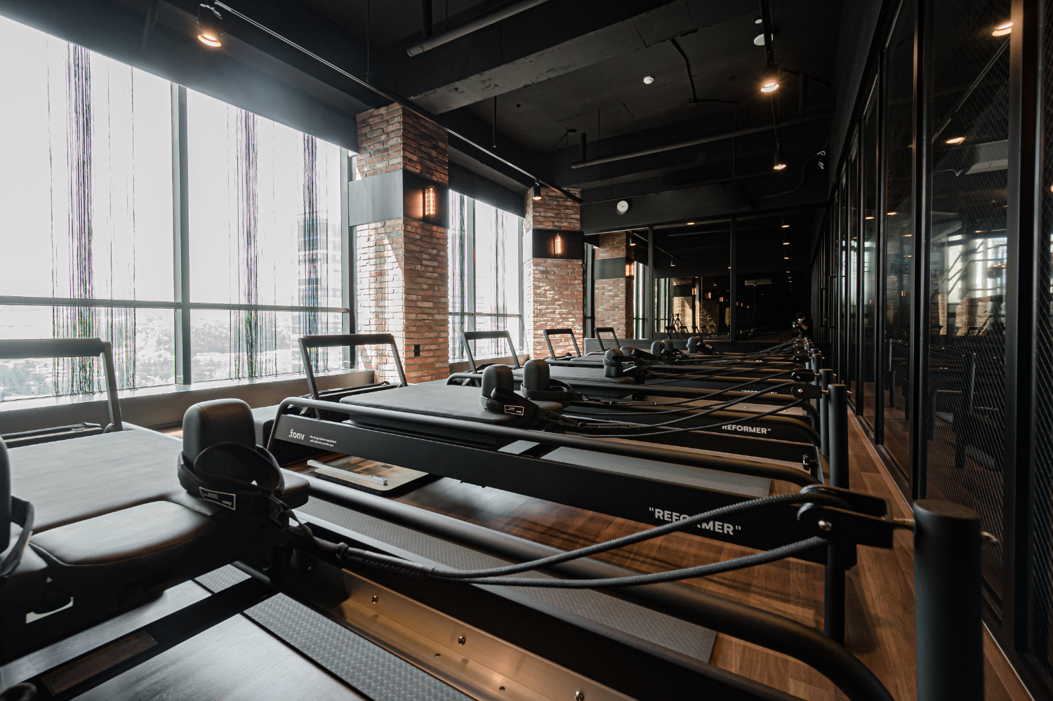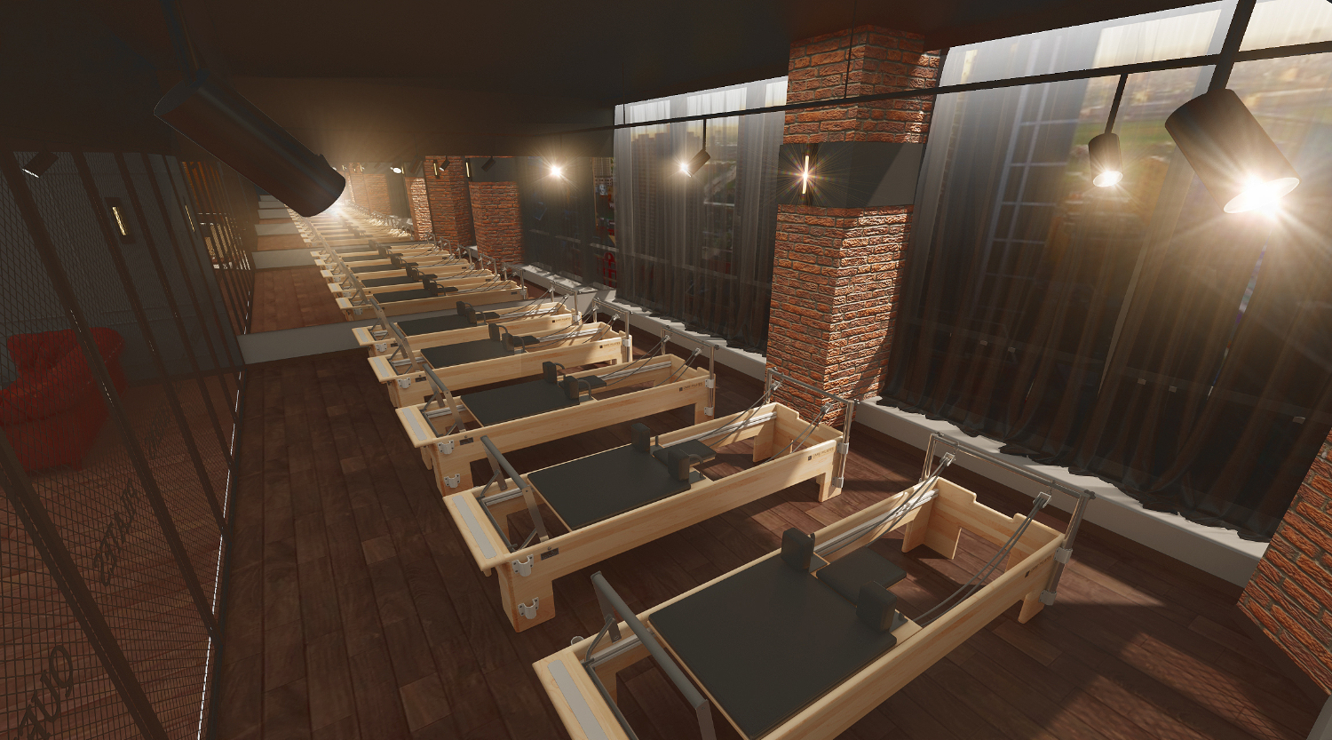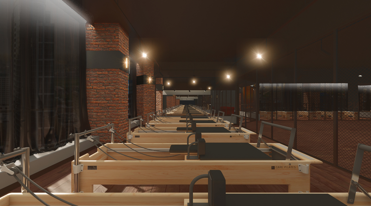 룸에는 시야 확보와 안전을 위해 레일 조명과 벽면등으로 밝게 연출했습니다. 벽돌 마감재에 따뜻한 색감의 조명이 더해지니 고급스러움은 물론 편안한 분위기의 필라테스 인테리어가 된 것 같습니다.