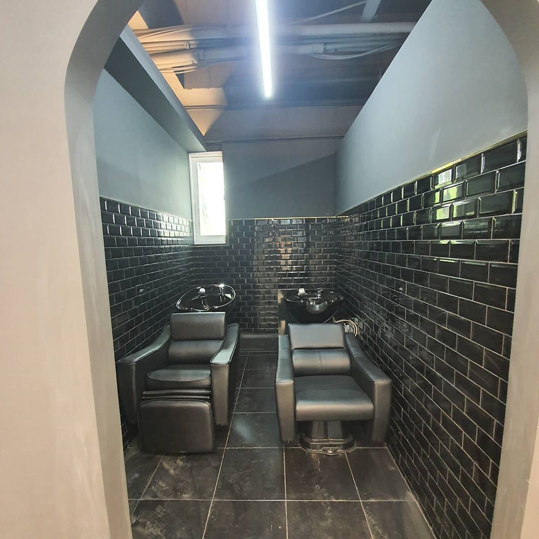샴푸 공간은 물에 강한 타일로 벽면과 바닥을 마감했는데요, 세면대, 체어도 함께 블랙 컬러로 통일해 세련되면서 고급스러운 분위기를 한껏 올렸습니다.