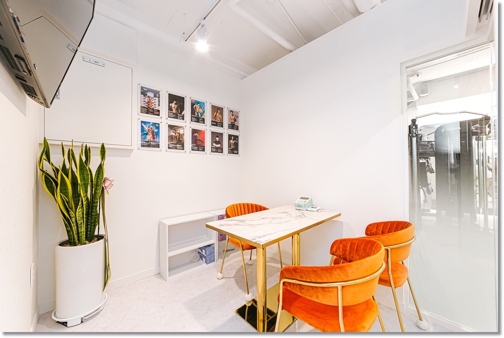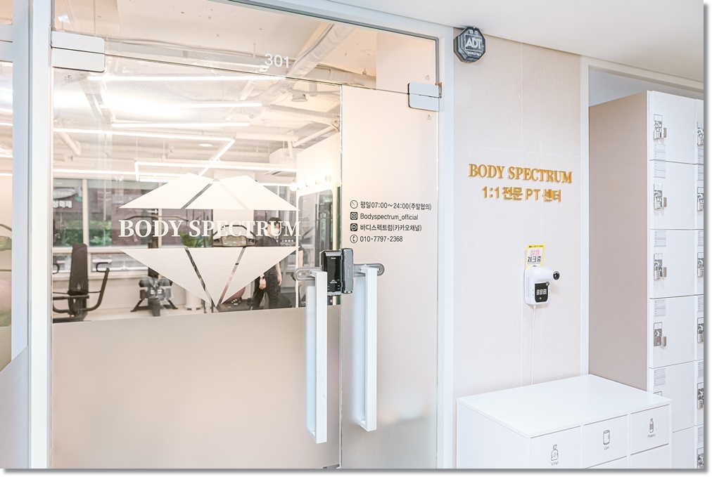 입구에서부터 화이트그린 포인트가 매력적인 하남 미사 분당 헬스장 피티샵인테리어가 완료된 모습을 살펴볼까요? 외부 파사드는 올 화이트를 적용했고 도어는 시트지를 시공한 유리로 시공해 개방성과 프라이버시를 모두 확보했습니다. 위드 코로나를 대비해 발열 체크기를 외부에 달았고 분리수거함을 배치해 외부 쓰레기의 유입을 막고 개인 락커를 외부에 설치해 실외화에 묻어있는 오염물질이나 먼지를 차단했습니다.