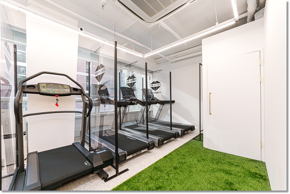 과거의 헬스장은 운동기구들만 나열돼있는 곳이었다면 최근에는 심플하면서 차분하고 운동과 힐링의 목적을 가진 곳으로 조성되는 것이 많습니다. 그런 이유로 자연과 비슷한 느낌을 주는 인테리어를 많이 볼 수 있는데요, 이번 현장 또한 자연 속에서 걷고 운동하는 느낌을 주기 위해 바닥에 인조잔디를 깔았고 자연광을 충분히 활용할 수 있도록 했습니다.