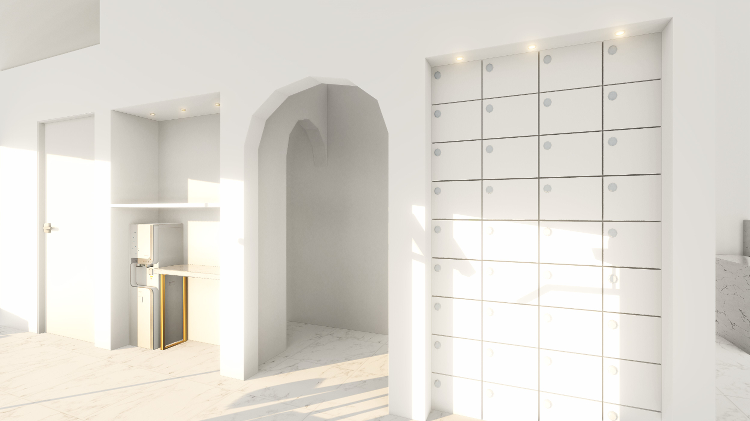 또한 탈의실 내부도 전체 화이트 대리석과 골드 조합을 이어갔으며 모든 캐비넷에는 비밀번호를 부착하여 도난에 대한 우려를 줄였습니다. 그리고 단순하면서도 깔끔한 배치로 공간을 확장한 느낌을 냈는데요.