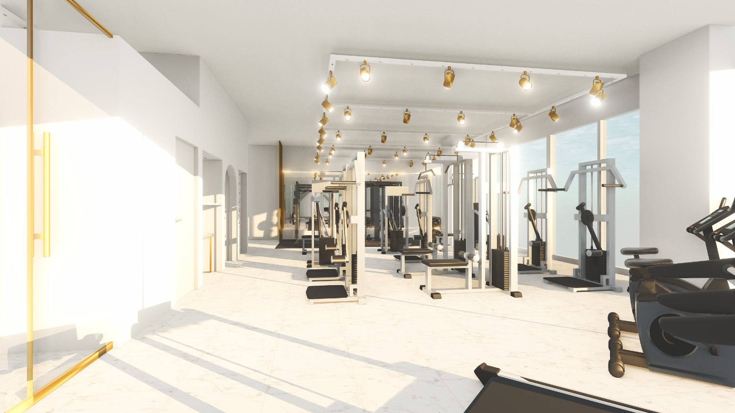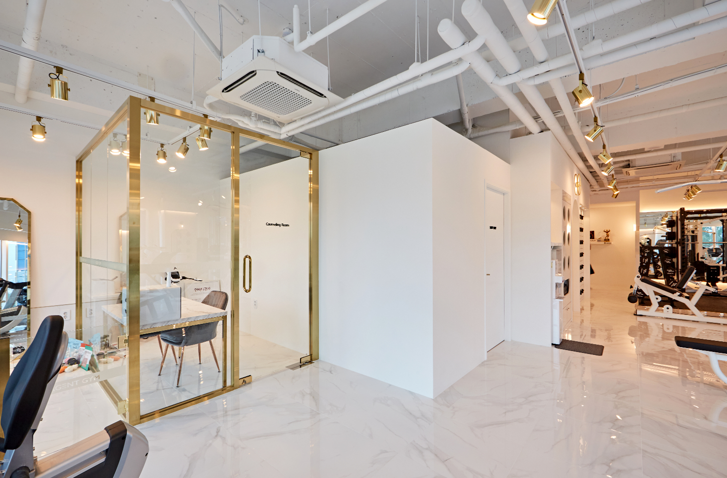 하남 미사 상가인테리어 헬스장 피티샵 화사한 화이트와 골드컬러의 고급스러운 조합
