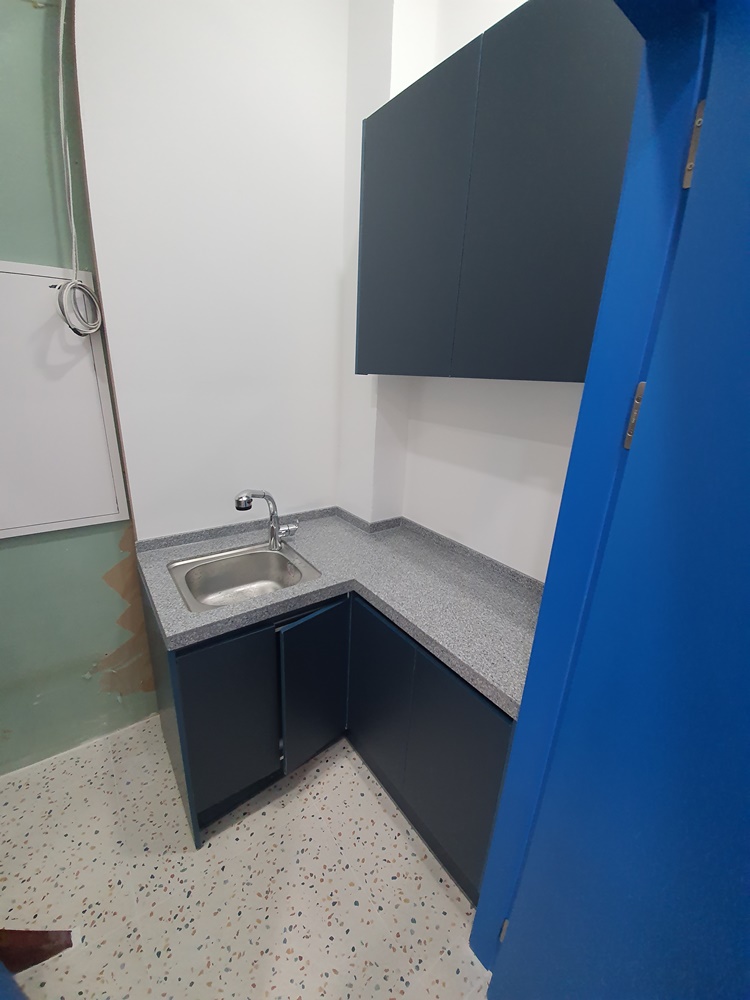 블루와 그레이로 디자인을 통일 시킨 수납장, 탕비실 공간입니다. 하남 미사 에코큐브 사무실 인테리어 견적이 궁금하시다면 각 업체의 플랫폼에서 소형사무실인테리어부터 대형평수까지 비용 견적 알아보기를 활용해 보시고 디테일한 사항이 궁금하시다면 저희 916디자인에 문의해 주세요. 합리적인 비용으로 디자인, 설계, 시공을 책임지고 완벽하게 진행해 드리겠습니다.