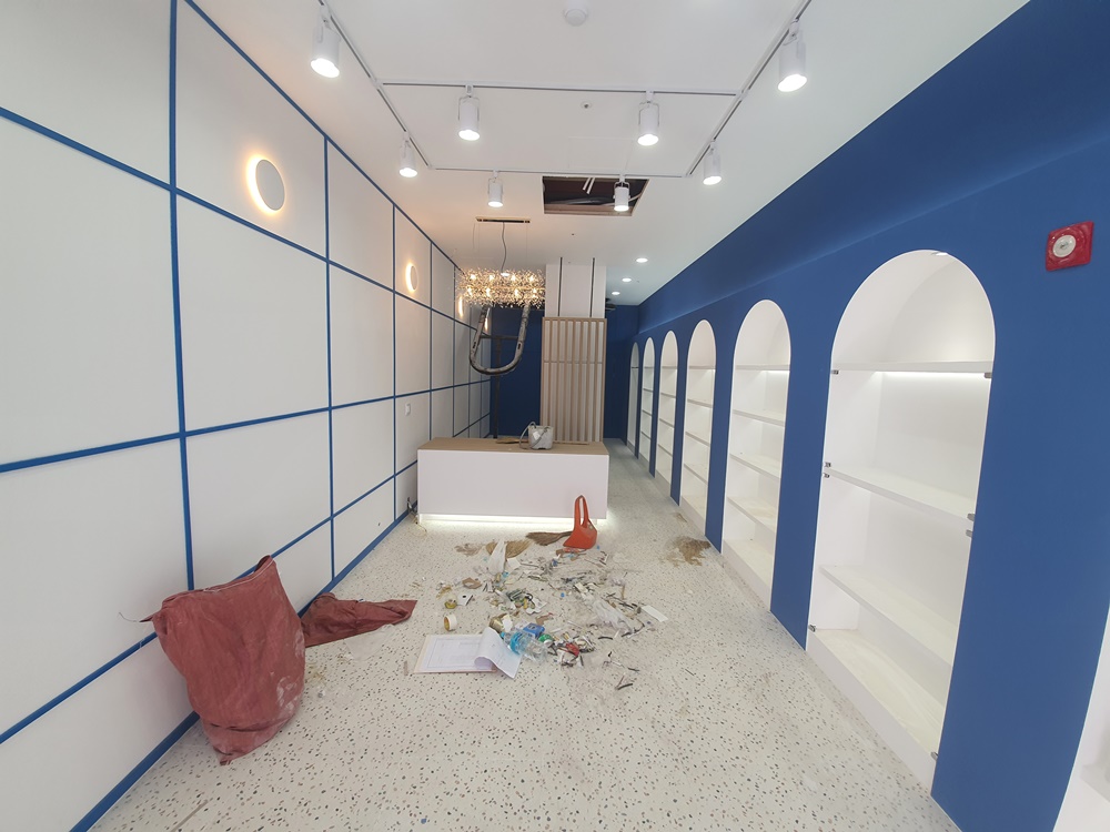 화이트 마감과 블루 도장이 잘 어우러져 특색있는 공간으로 완성된 모습입니다. 벽면은 화이트로 마감하고 진열장과 같은 색인 블루로 격자 무늬 디자인 작업을 진행해 깔끔한 느낌을 부각했고 바닥은 최근 다시 유행하고 있는 테라조 무늬로 마감해 트렌디한 분위기를 연출하고 있습니다. 조명은 천장 레일 조명과 벽면 포인트 조명을 간접등으로 시공해 은은하면서 세련된 분위기를 연출했고 카운터 공간에는 팬던트형 디자인 조명을 시공했습니다.