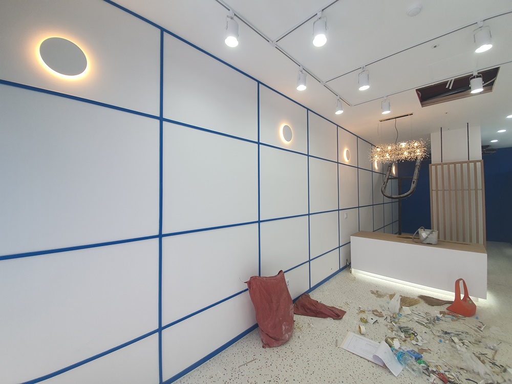 공사가 시작되면 기존 시설물과 불필요한 구조물은 철거를 하고 천장 배선, 배관, 공조, 소방 등의 시설을 점검하고 정리한 후 목공 작업을 진행하게 됩니다. 목공 작업에는 레이아웃에 맞춰 구조를 나누는 작업과 공간에 멋을 주는 치장을 하는 작업이 있습니다. 벽면에 빌트인으로 설치하는 가구나 아트월, 조형물 등은 치장 작업에 속하는데요, 이런 모든 작업은 안전 시공이 중요하기 때문에 베테랑 전문인력과 함께 공사를 진행하고 있습니다.