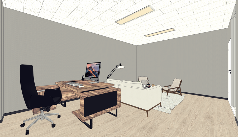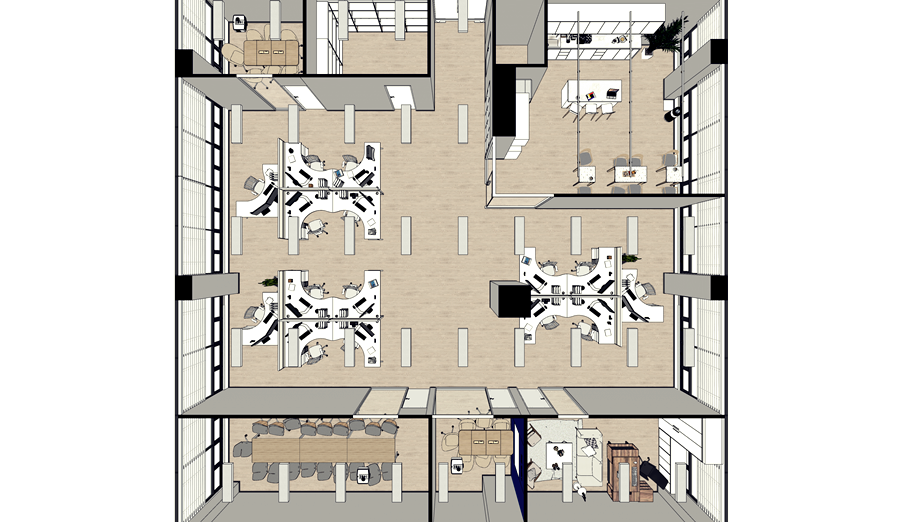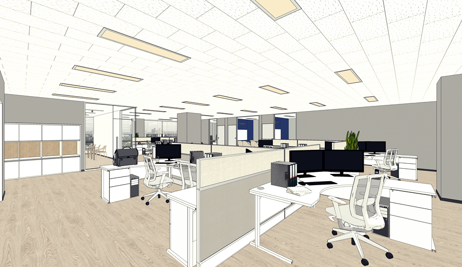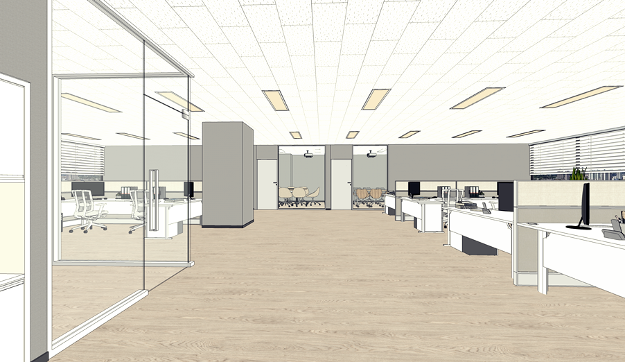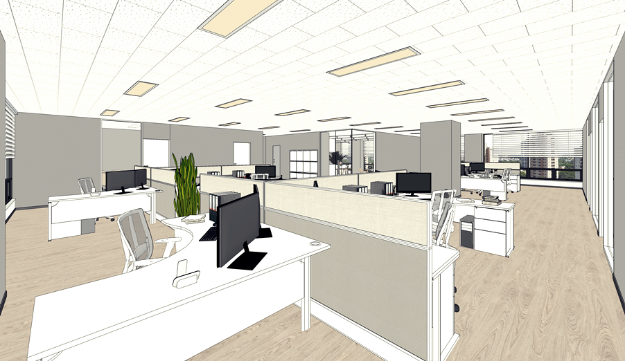 오픈형으로 계획된 공용 사무공간입니다. 아이소매트릭으로 그려진 도면도 대략적인 느낌은 오지만 3D로 시뮬레이션한 이미지와는 퀄리티적으로 차이가 많이 나죠? 우드톤으로 바닥을 마감하고 낮은 파티션을 적용해 개인 공간을 보장했으며 매립형 천장 조명을 계획해 층고를 확보하고 깔끔한 모습을 갖췄다는 정도는 아이소매트릭으로도 알 수 있지만 어떤 분위기로 구현되는지는 3D 이미지를 봐야 제대로 이해가 되는 것을 확인할 수 있습니다.