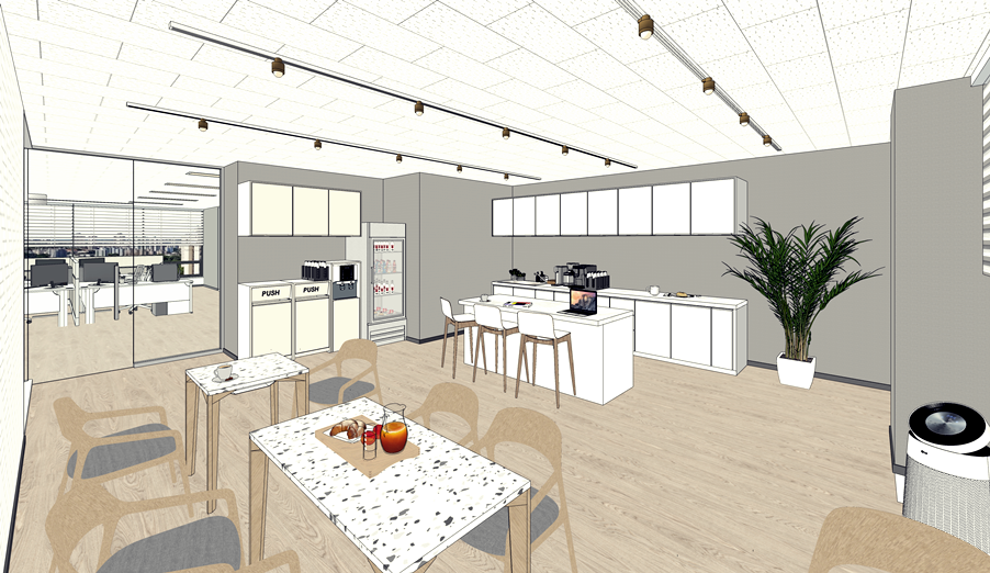 카페테리아입니다. 최근 일 할 땐 일하고 쉴 땐 쉴 수 있는 기업 문화가 유행하면서 자유로운 분위기에서 편하게 쉴 수도 있고 방문객을 응대할 수도 있고 자유로운 업무를 진행할 수 있는 카페테리아가 사무실인테리어 트렌드입니다.