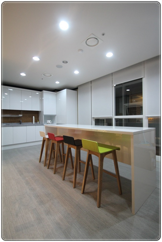 조명은 매입형 조명으로 시공해 깔끔하면서 화사한 공간으로 인테리어 했고 바닥은 청소하기 편하고 오염에 강한 데코타일로 마감했습니다. 팁을 하나 드리자면 전체적으로 화이트로 마감을 하면 깔끔하고 화사한 느낌은 있지만 지루할 수 있는데 이번 현장처럼 한 쪽 면은 다른 색이나 질감의 벽지를 사용하고 가구에 컬러를 활용하면 포인트가 될 수 있으니 활용해 보세요.