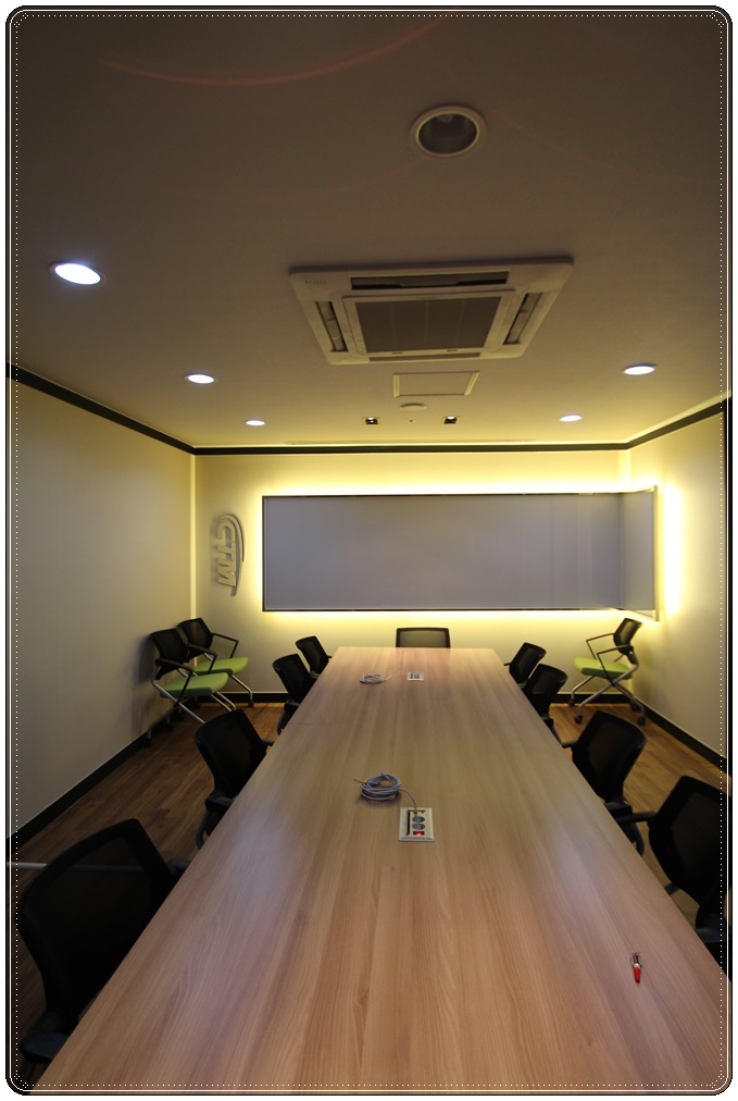 회의실입니다. 전체적으로 블랙 & 화이트로 모던하게 꾸몄고 의자 그린 컬러로 포인를 줬습니다. 공용 사무공간과 같은 매입형 조명을 시공했고 한쪽 벽면에 글래스 보드를 시공해 간접 조명을 설치함으로써 은은한 분위기를 조성면서 동시에 사용성과 편리성을 높였습니다. 벽면에는 회사 로고를 부착해 정체성을 부여하고 가독성을 높였으며 직원들에게는 소속감을 느낄 수 있도록 의도했습니다.