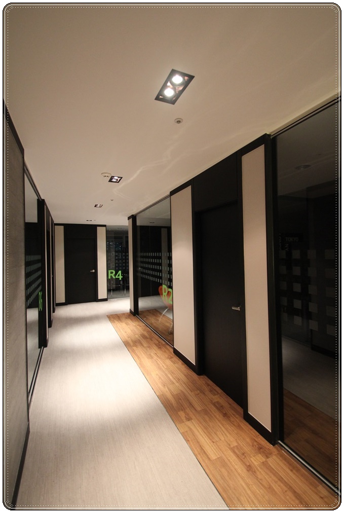 복도 공간입니다. 문틀과 문은 블랙 컬러로 시공하고 벽면은 화이트로 시공해 블랙 & 화이트의 심플하면서 모던한 분위기를 연출했습니다. 각 룸의 가벽은 유리로 시공해 개방감을 부여함으로써 답답해 보이지 않게 했고 공간이 확장돼 보이게 했으며 시트지를 디자인 시공해 직접적인 노출을 차단했습니다.