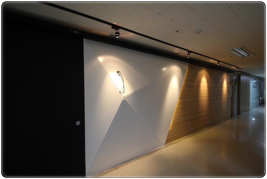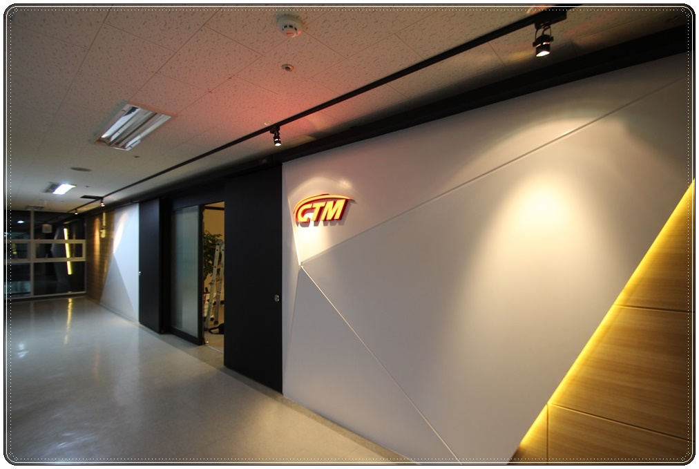 회사로고가 부착된 입구 파사드입니다. 복도식으로 밀집해 있는 건물에서 입구 파사드는 회사의 이미지를 대표하는 첫인상이기 때문에 사람들으비 시선을 사로잡을 수 있는 디자인을 선호하시는 편입니다. 그도 그럴 것이 첫인상을 결정하기도 하지만 홍보, 마케팅의 목적으로도 활용될 수 있는 공간이 입구 파사드이기 때문에 공사비용은 추가되더라도 반드시 진행하는 익스테리어입니다.