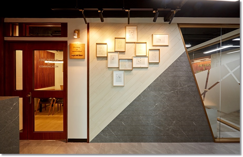 로비에 배치한 아이디어룸인데요, 회의실로도 활용할 수 있는 공간입니다. 자유롭게 의견을 내면서 협의를 하는 과정이 필요한 아이디어 회의실은 소음이 발생하는 경우가 많기 때문에 입구쪽에 배치해 내부에 영향이 덜하도록 했죠. 목공 가벽으로 공간을 분리하면 내부는 물론 복도도 답답해보일 수 있어 유리와 목공 가벽으로 구성해 분리했고 조명을 크로스로 시공해 충분한 조도를 확보했습니다.