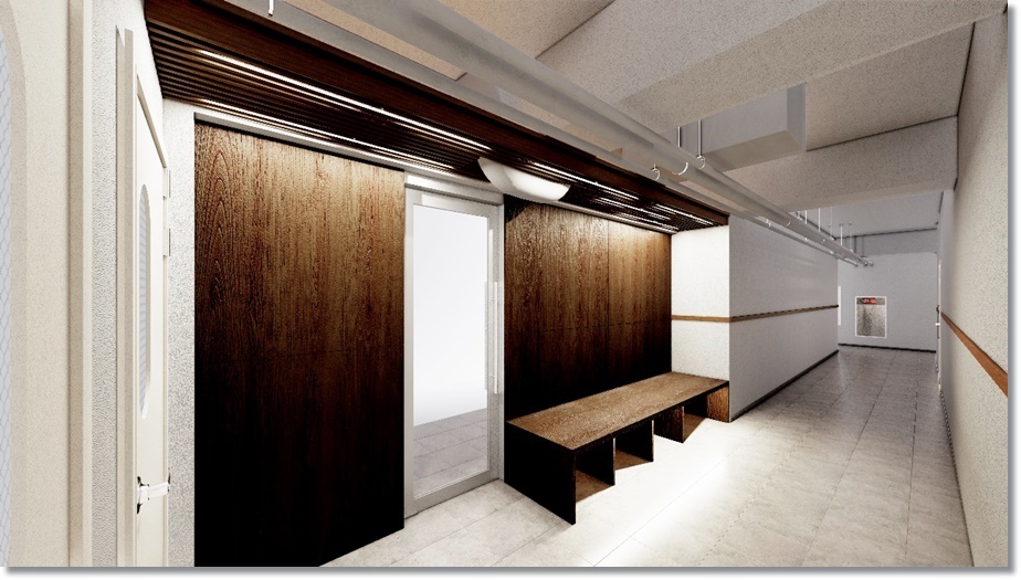 각 공간으로 이동할 수 있는 복도입니다. 가벽을 세워 공간을 분리하면서 생긴 복도를 동선으로 설정해 각 공간을 쉽게 찾아갈 수 있도록 했습니다. 오픈형 천장으로 시공해 층고를 확보했고 블랙으로 도색해 깊이감을 줌으로써 더욱 넓게 느껴지도록 했고 바닥은 그레이톤으로 마감해 밸런스를 맞췄습니다. 복도를 따라 라인조명을 시공해 동선을 유도하면서 밝은 조도를 확보하도록 했고 각 공간에 맞는 벽면 디자인을 적용해 영역성을 명확히 했습니다.