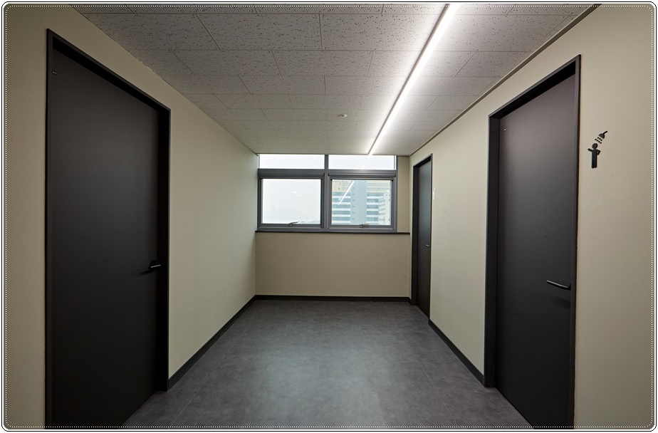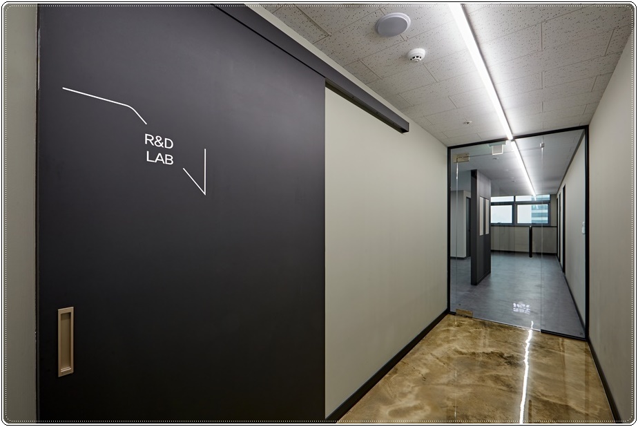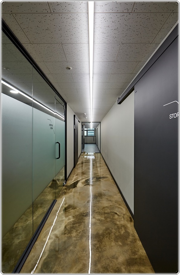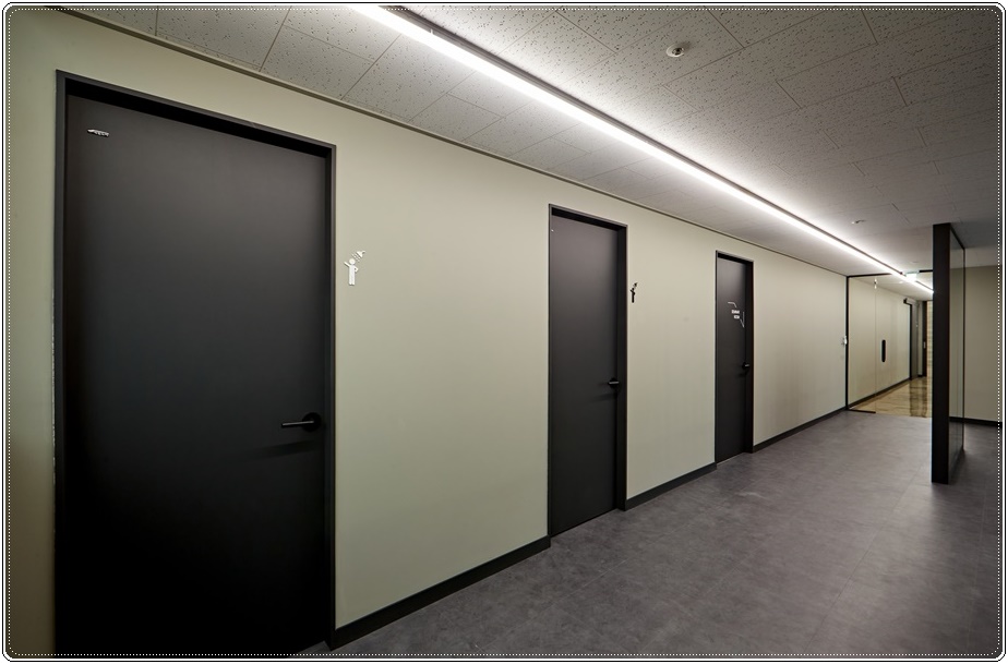 방문객 동선과 직원 동선이 나뉘는 곳의 바닥 마감을 달리해 영역성을 명확하게 하고 가독성을 높였습니다. 직원 동선의 복도는 아이보리 컬러의 벽면과 진그레이 바닥 그리고 블랙 컬러의 도어를 슬라이드로 시공해 깔끔하면서도 효율적인 공간 활용이 가능하도록 했습니다. 천장에는 동선을 따라 라인 조명을 시공해 어두운 곳 없이 충분한 조도를 확보함으로써 답답하고 좁아보이는 단점을 극복했습니다.