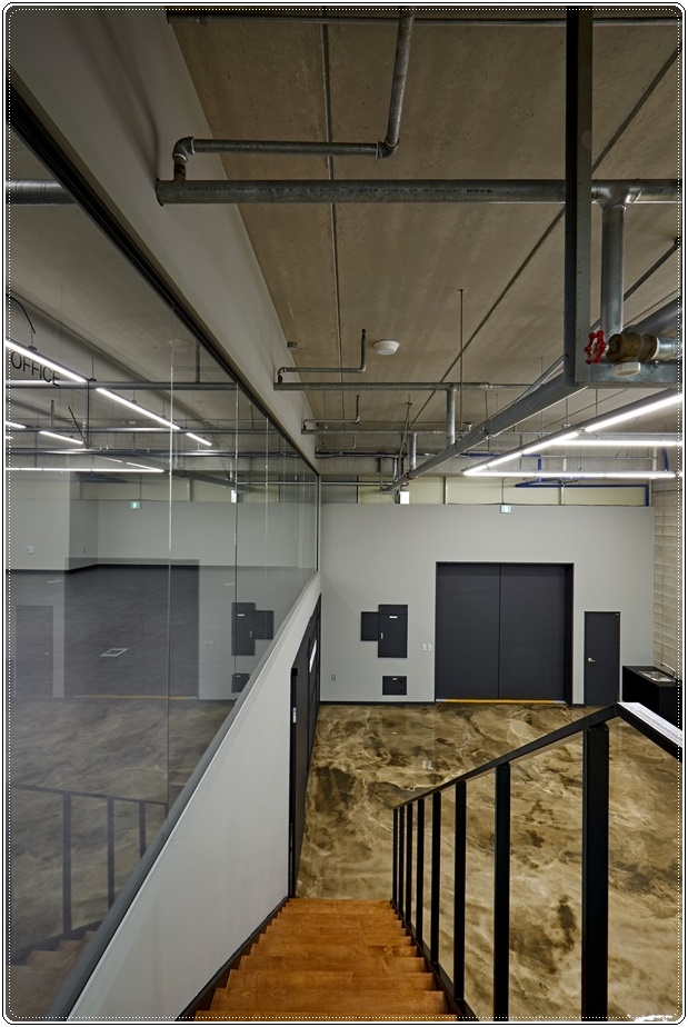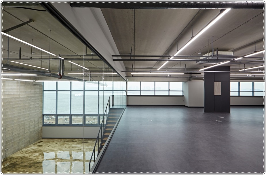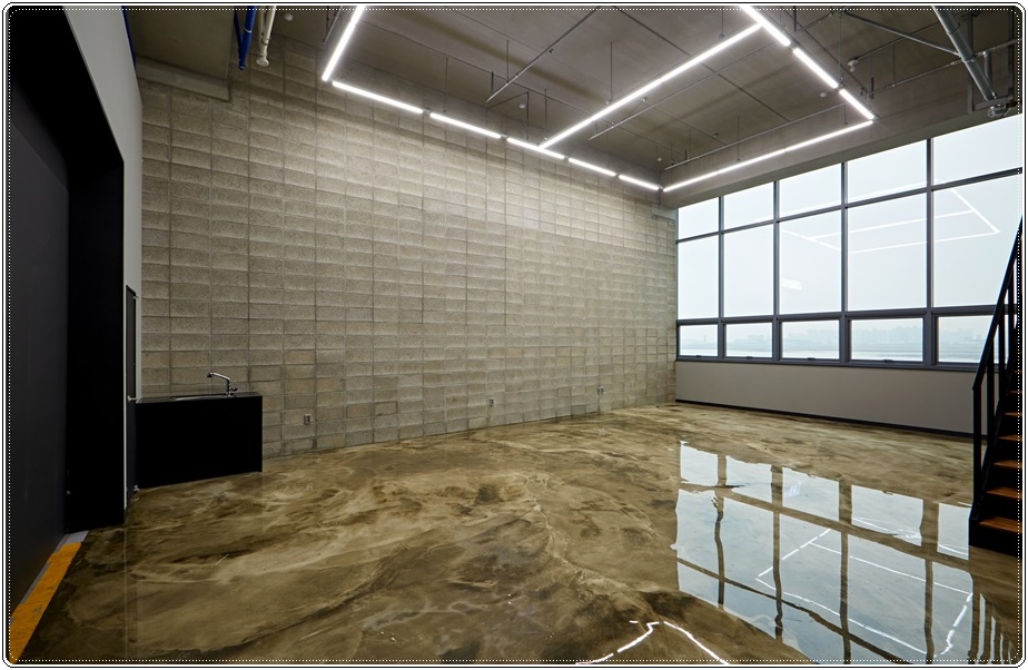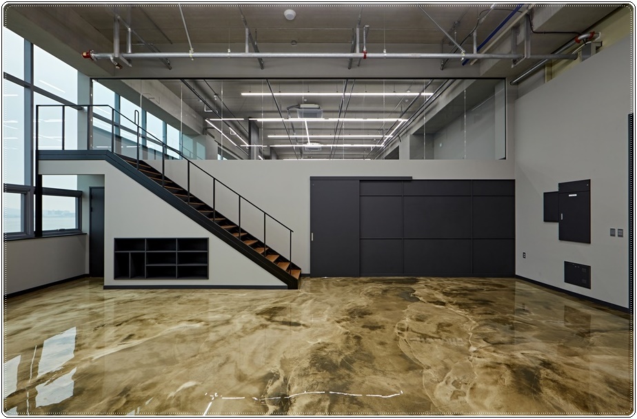 또한, 외부 방문객의 동선을 제한하기 위해서 회의실과 세미나실도 입구측에 배치하고 대표실과 임원실은 복층에 계획했으며 직원들은 가장 안쪽 공간에 사무실을 배치해 아무 방해없이 근무하고 업무 효율을 높일 수 있도록 했습니다. 층고 확보를 위해 노출천장으로 시공하고 벽면에 석재로 마감해 인더스트리얼 컨셉트를 적용했고 단층의 로비공간과 복층 하부의 방문객 동선까지의 바닥은 유광의 빈티지 노출로 마감해 영역성을 명확히 했습니다.