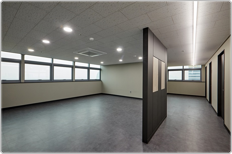 공용 사무실입니다. 통합형으로 시공해 다양한 공간 활용이 가능하도록 했습니다. 통합형 사무실은 많은 장점이 있지만 그 중 조직개편이나 증원 등에 유연하게 대처할 수 있고 변화를 줄 수 있다는 점이 사무실이나 사옥 인테리어에서 굉장한 매리트랍니다. 하지만, 그냥 하나의 공간으로만 둔다고 통합형 사무실로 사용할 수 있는 것이 아니기 때문에 공간에 맞는 벽면 마감과 가구 배치 등이 동반되어야 하므로 반드시 전문업체와 상담 후 시공하시는 것이 바람직합니다.