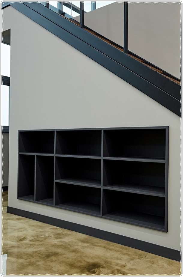 복층 상부로는 계단을 이용해 진입할 수 있습니다. 계단은 블랙 드레임과 우드톤을 매치해 모던한 느낌을 강조했으며 손잡이를 시공해 안전하게 사용할 수 있도록 했답니다. 계단의 하부에는 매립형 수납장을 시공해 다양하게 활용할 수 있도록 했는데요, 자료를 꽂아두거나 소품을 진열하면 그 자체로도 인테리어가 될 수 있습니다. 사진에서는 보이지 않지만 계단 뒤편은 창고로 사용할 수 있도록 시공해 죽은 공간이 나오지 않도록 알차고 실용적인 인테리어로 채워드렸답니다.
