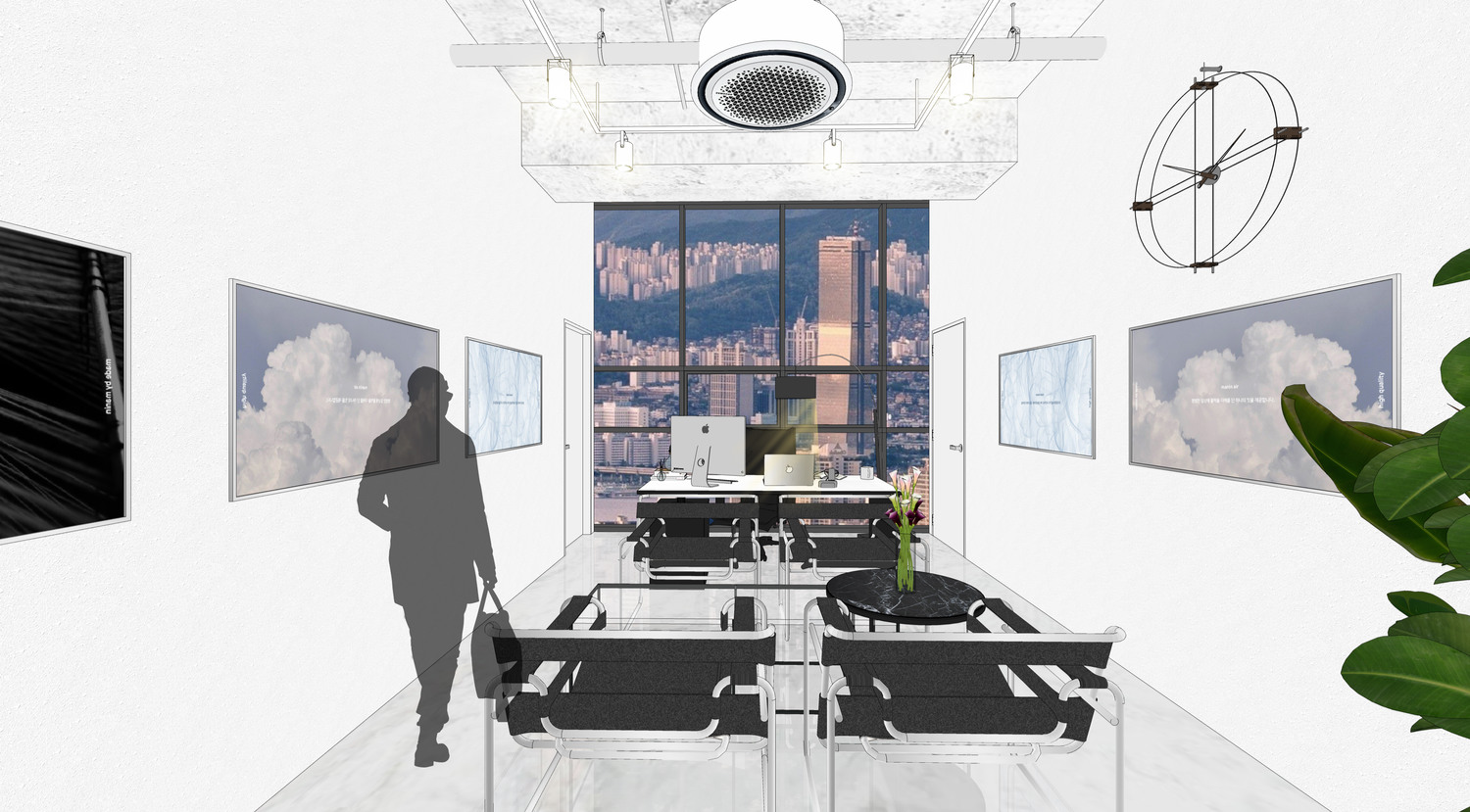 사무공간은 심플하면서도 외부의 야경을 바라볼 수 있고 수평적인 구조에 맞는 미니멀한 컨셉으로 연출했습니다.