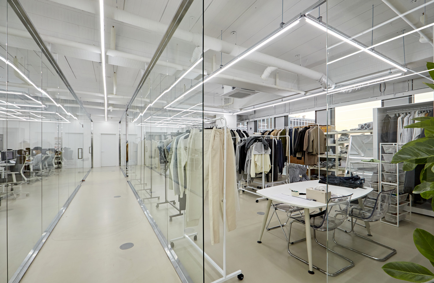 또 사무공간의 옆에는 마치 옷가게에 온듯한 의상보관실이 준비되어 있습니다. 여기에서 모든 신상품이 진열되고 촬영을 위한 준비를 하기도하고, 출고 준비를 마치기도 하는데요. 패션 사업은 주기가 매우 빠르게 돌아가며 민감하게 대응해야하기 때문에 그런 이미지를 보여주고 서로간의 피드백을 빠르게 이뤄내기 위해서 전부 유리창으로 시공을 도와드렸는데요. 전체적으로 차가울 수 있지만 모던하고 세련된 느낌이 바로 합정 공덕 쇼핑몰 사무실인테리어의 컨셉이라고 할 수 있습니다.