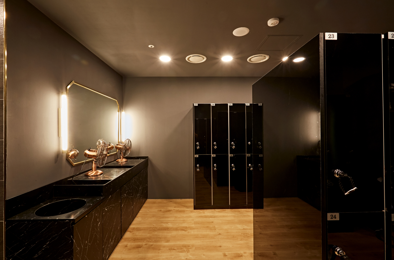 혜화 성신 돈암 헬스장인테리어의 탈의실 및 샤워실은 마치 고급 호텔을 연상하게 하는데요. 블랙 인테리어의 고급스러움에 골드 컬러를 더하였고, 팔각 거울과 대리석 질감의 테이블이 마련되어있습니다.