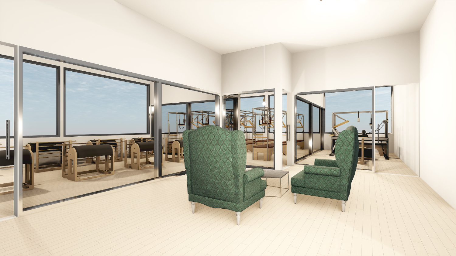 프라이빗룸은 1:1로 수업이 진행되는 곳이기에 여러 기구들을 곳곳에 배치하였고, 전면 유리로 시공하여 자신의 모습을 바라볼 수 있게 만들어졌는데요. 맨 끝쪽에 위치하고 다른 공간들이 일렬로 배열되어 있기에 더욱 확장되어 보이는 느낌을 받을 수 있습니다.