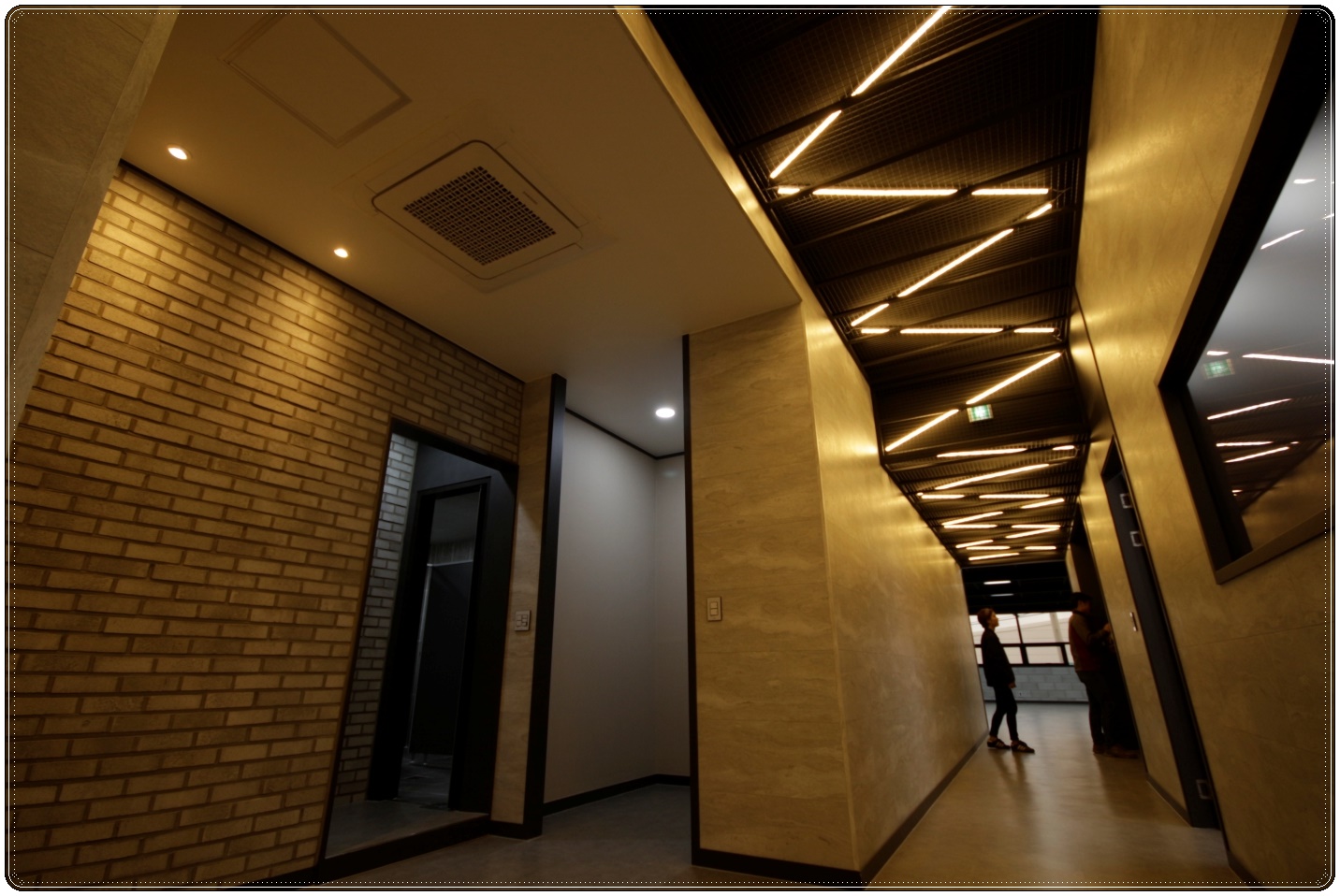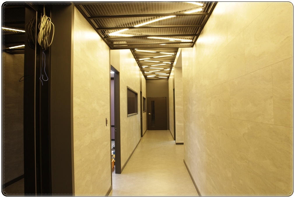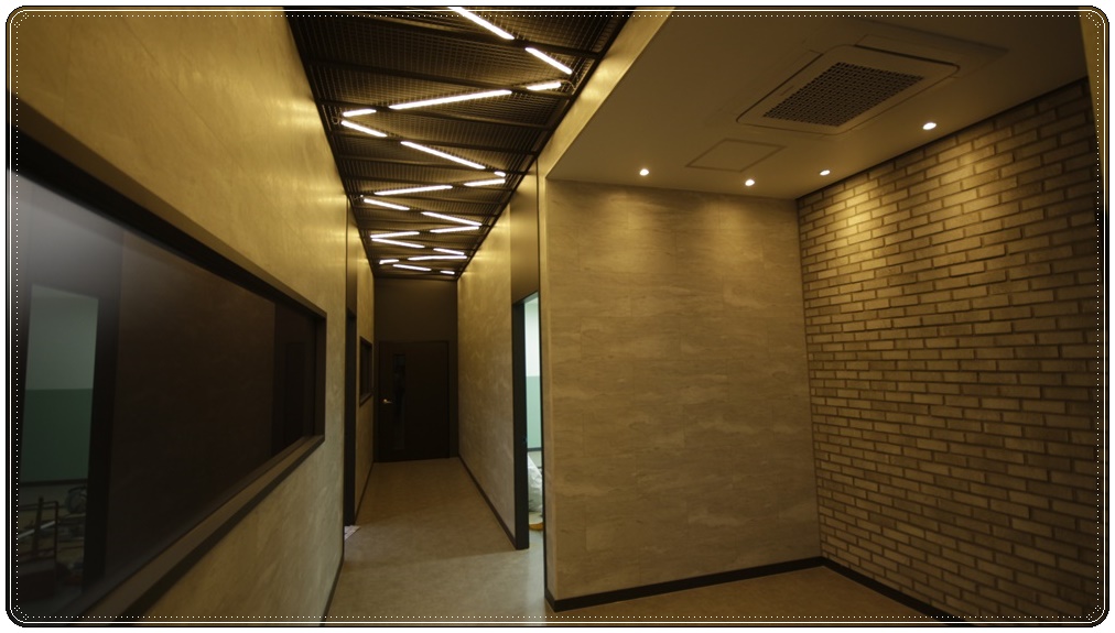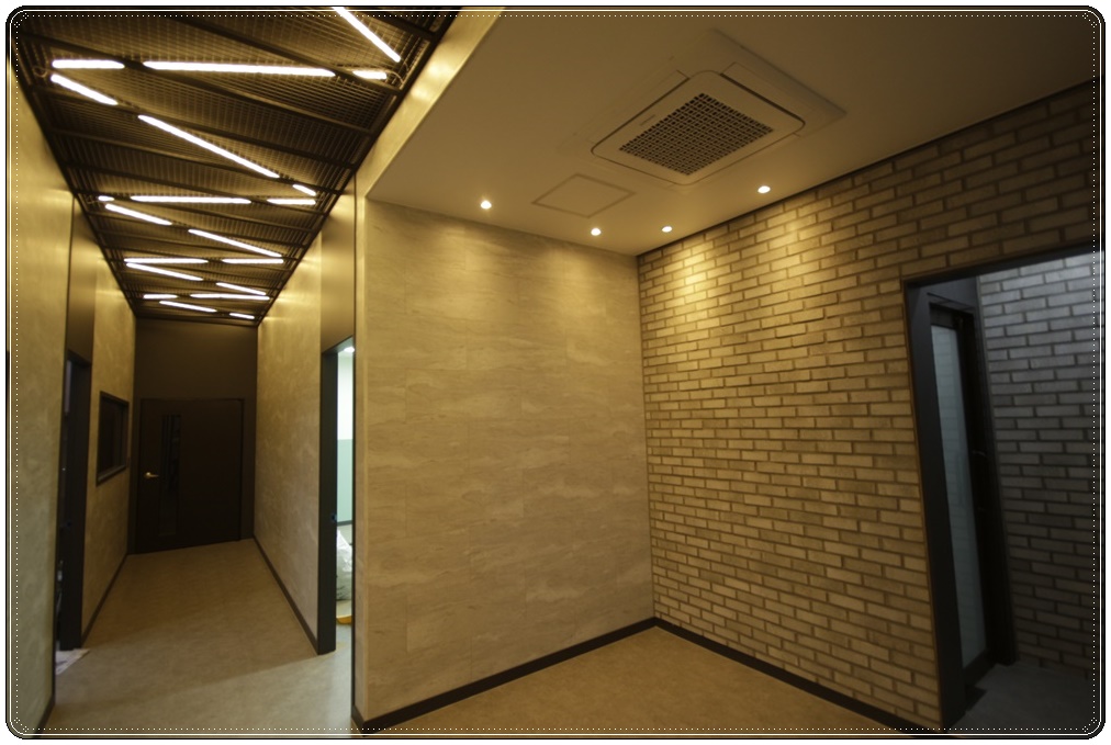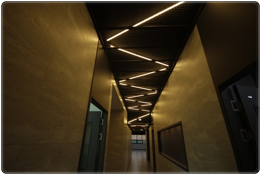 사무실로 진입하는 입구와 복도입니다. 전체적으로 대리석 타일로 마감해 고급스러운 부위기를 주었고 천장에 조명과 매시망을 시공해 모던 빈티지를 연출했습니다. 공장의 삭막함과 거친 느낌을 없애고 밝고 화사한 공간으로 연출하기 위해 T5 간접조명을 이용해 지그재그로 디자인해 시공하고 금속 매시망을 덧대 포인트를 줬습니다. 최근 유행하고 있는 매시망은 빈티지하면서 현대적인 느낌을 들게 해 감각적이고 멋스러운 공간을 연출할 수 있는 아이템입니다.