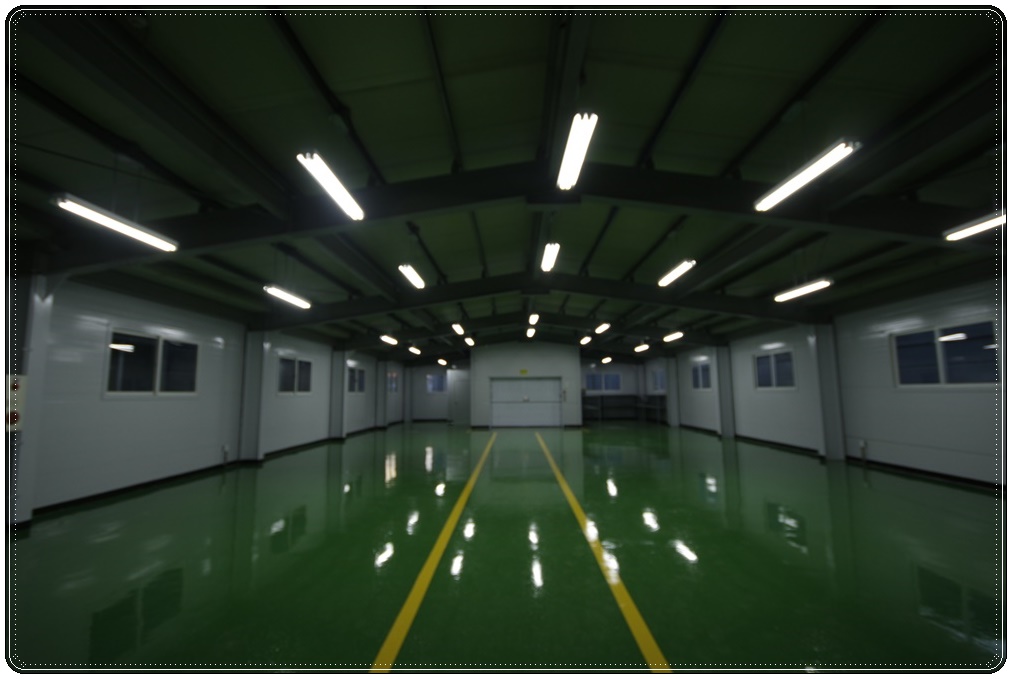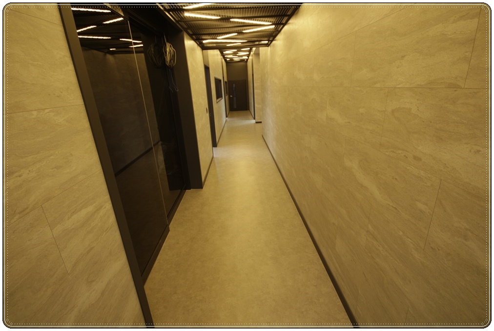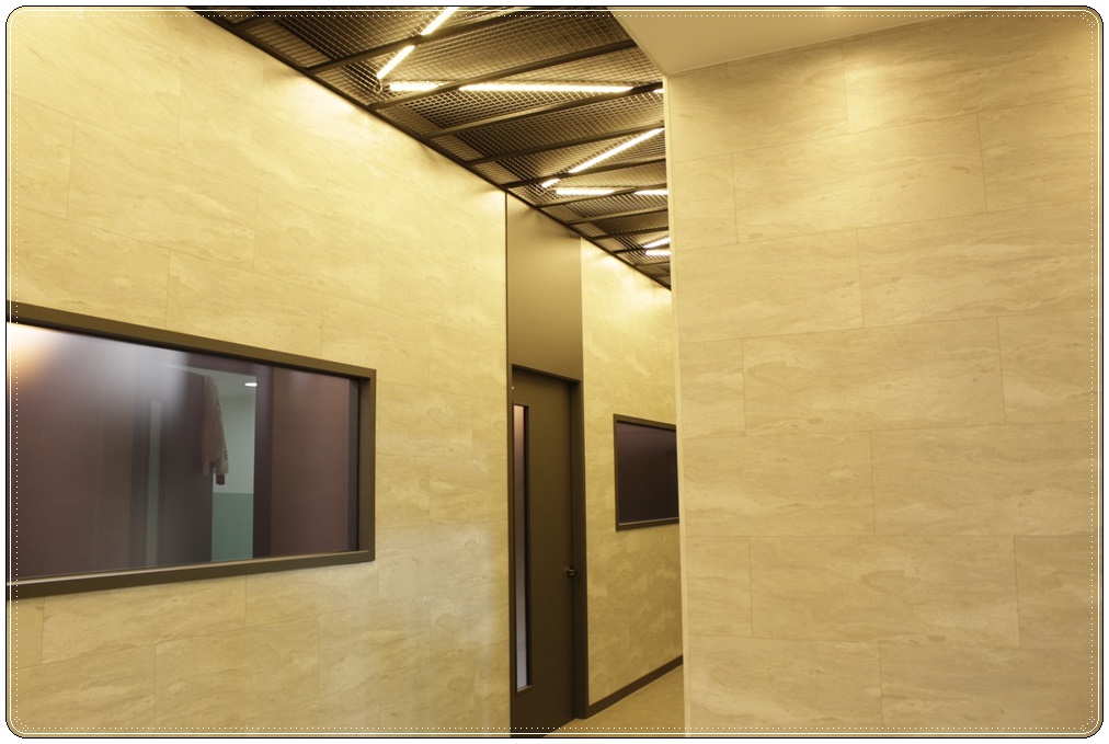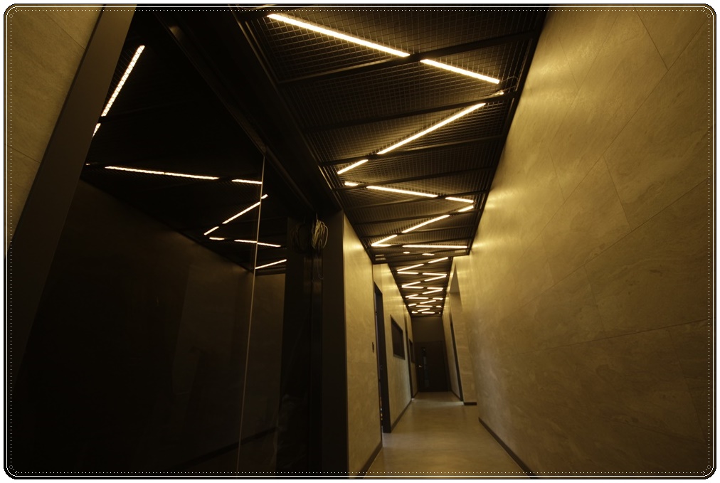 사무실로 진입하는 입구와 복도입니다. 전체적으로 대리석 타일로 마감해 고급스러운 부위기를 주었고 천장에 조명과 매시망을 시공해 모던 빈티지를 연출했습니다. 공장의 삭막함과 거친 느낌을 없애고 밝고 화사한 공간으로 연출하기 위해 T5 간접조명을 이용해 지그재그로 디자인해 시공하고 금속 매시망을 덧대 포인트를 줬습니다. 최근 유행하고 있는 매시망은 빈티지하면서 현대적인 느낌을 들게 해 감각적이고 멋스러운 공간을 연출할 수 있는 아이템입니다.