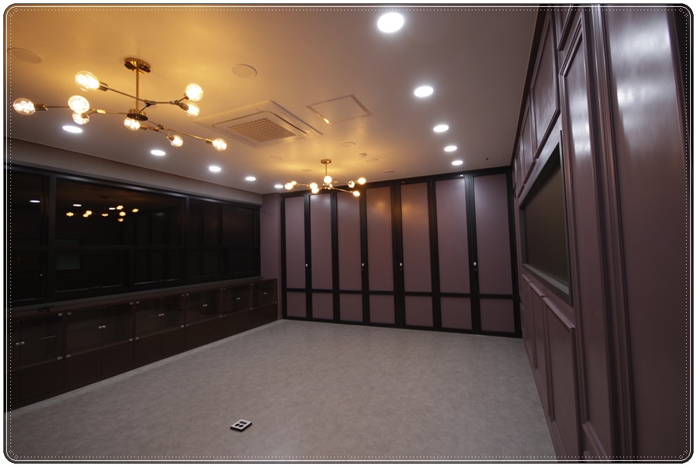 웨인스코팅으로 마감한 인디고 핑크 컬러 벽면이 특색있는 접견실입니다. 외국 바이어가 많이 방문하는 회사의 특성상 접대를 할 수 있는 공간을 요청하셔서 이국적인 분위기로 연출해드렸습니다. 폴딩도어를 시공해 공간을 나눠 사용할 수도 있고 하나로 사용할 수 있도록 해드렸으며 제품을 진열할 수 있는 수납공간과 진열장을 맞춤제작해 드렸습니다.