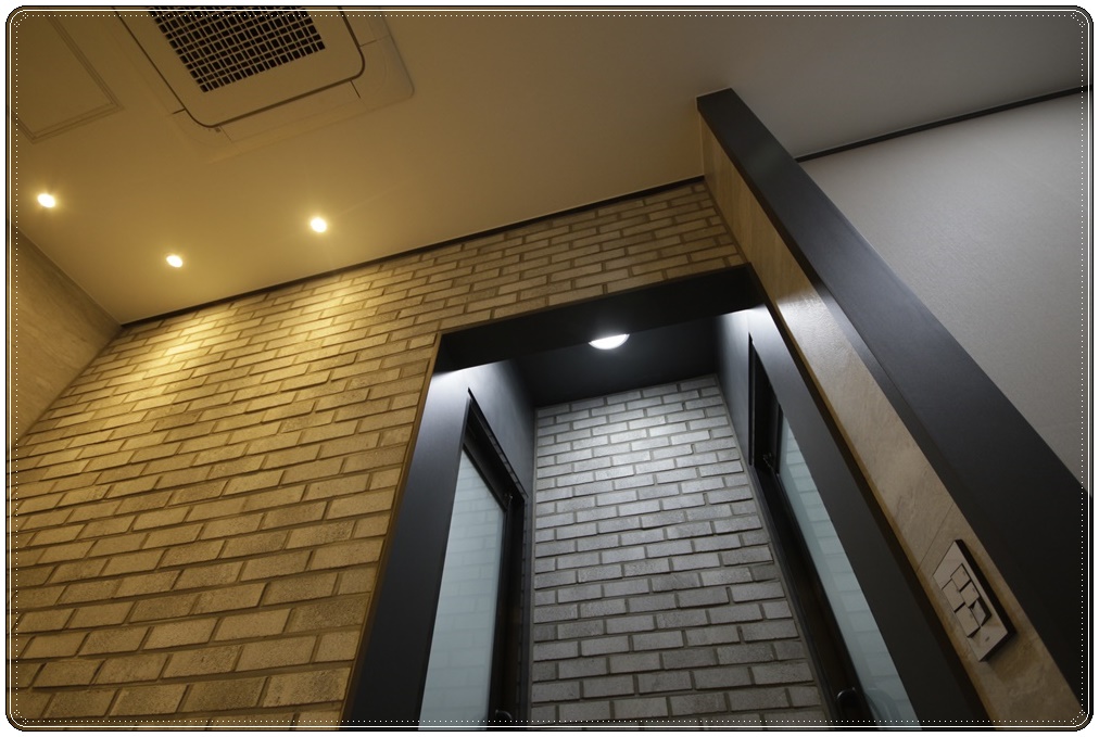 빈티지한 분위기는 화장실 입구의 시멘트 벽돌로 이어지면서 포인트가 되고 있습니다. 벽돌로 마감한 벽면에는 따뜻한 색감의 조명을 시공해 아늑하면서 안정적인 분위기를 연출했습니다.