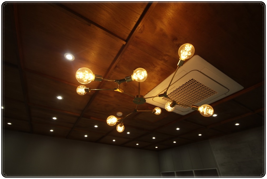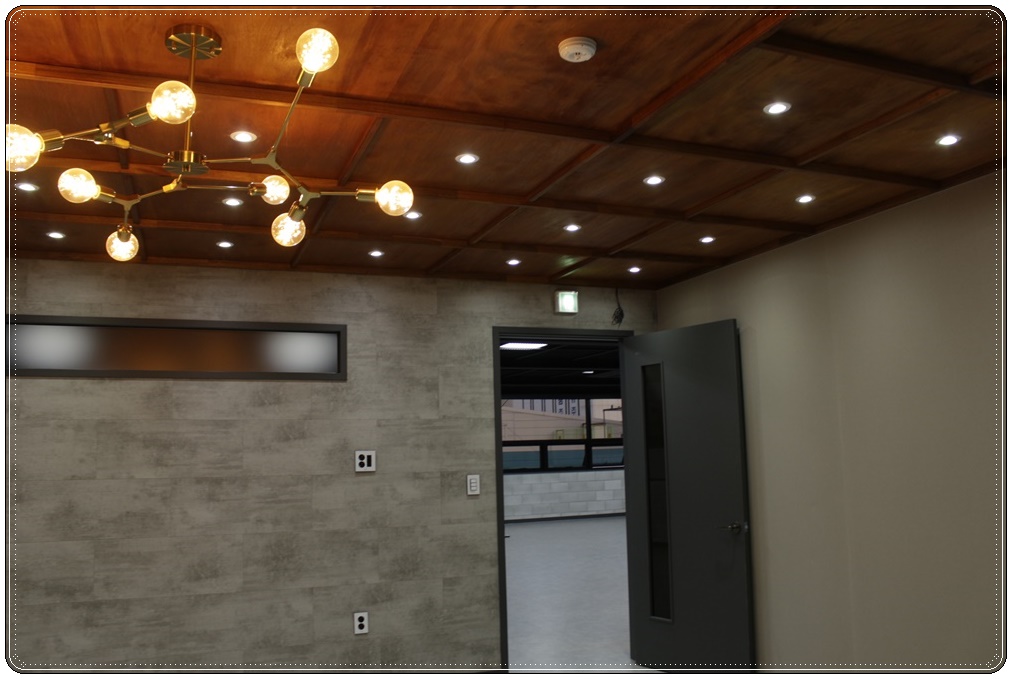 책상이 배치된 후 전원을 연결할 콘센트를 바닥으로 시공해 지저분한 전기선을 최소화할 수 있도록 시공해드렸습니다. 또한, 벽면 하단부에 시멘트 벽돌로 마감하고 천장 조명을 금속망을 덧대 디자인적 요소로 활용해 빈티지한 느낌을 부여했습니다.