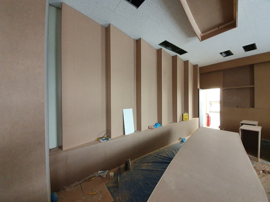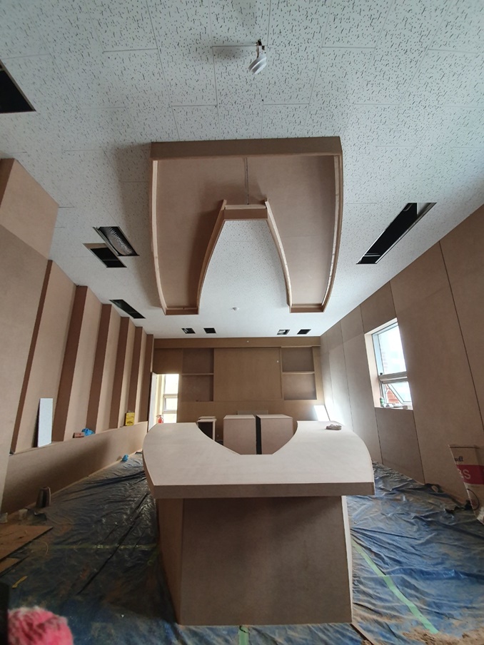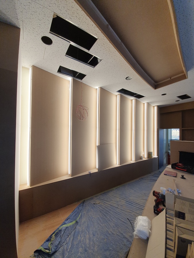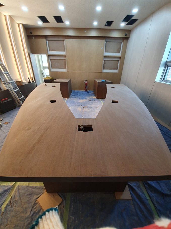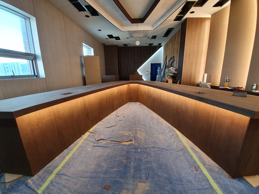 바닥 공사를 마친 후 바닥을 보양하고 바로 목공 작업을 시작했습니다. 이번 현장은 V자형 테이블부터 벽면까지 대부분 목공으로 이뤄질 예정이기 때문에 특히 더 정밀한 기술력과 꼼꼼한 시공력을 겸비한 전문인력과 함께 작업을 했습니다. 사실, V자형 테이블과 조명 프레임의 구현이 이번 현장의 핵심이라 살짝 걱정이 됐는데요, 얼핏 봐도 테이블과 테이블 라인에 맞춘 조명라인까지 완벽하게 시공이 돼서 정말 기뻤는데 고객님도 만족해하셔서 더욱 뿌듯했답니다.