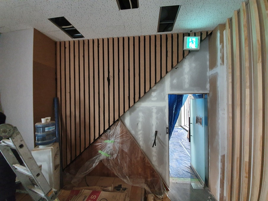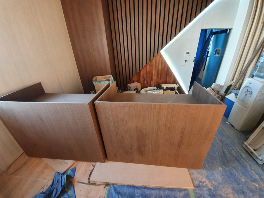 벽면에도 알판 작업으로 단차를 둔 디자인에 맞게 시공했고 마감 작업을 위해 프라이머를 발라줬습니다. 우드톤 마감은 필름 작업으로 했는데요, 필름은 종류도 다양하고 다채로운 디자인이 있어 선택이 폭이 넓으며 저렴하다는 장점이 있습니다.