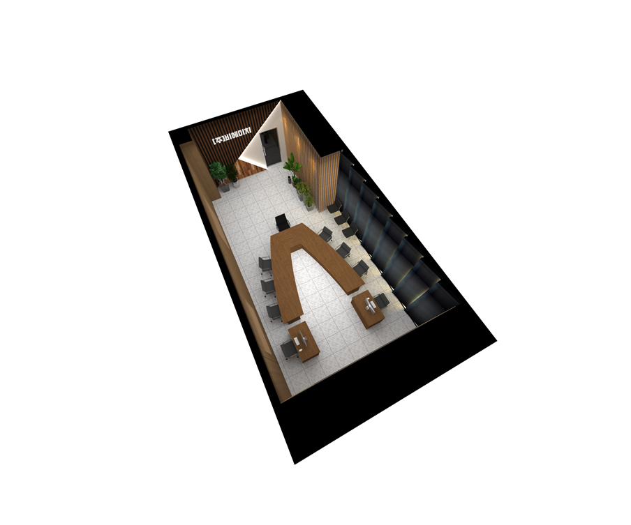 전체적으로 우드를 적용해 딱딱한 직사각형 평면을 아늑하면서 고급스럽게 디자인했고 3D 도면에서 눈길을 사로잡는 것은 V자형의 회의 테이블인데요, 이렇게 사선의 테이블을 회의 테이블로 사용하면 소통이 원활해지고 집중도가 높아져 빠른 시간에 좋은 결론을 도출할 수 있겠네요.