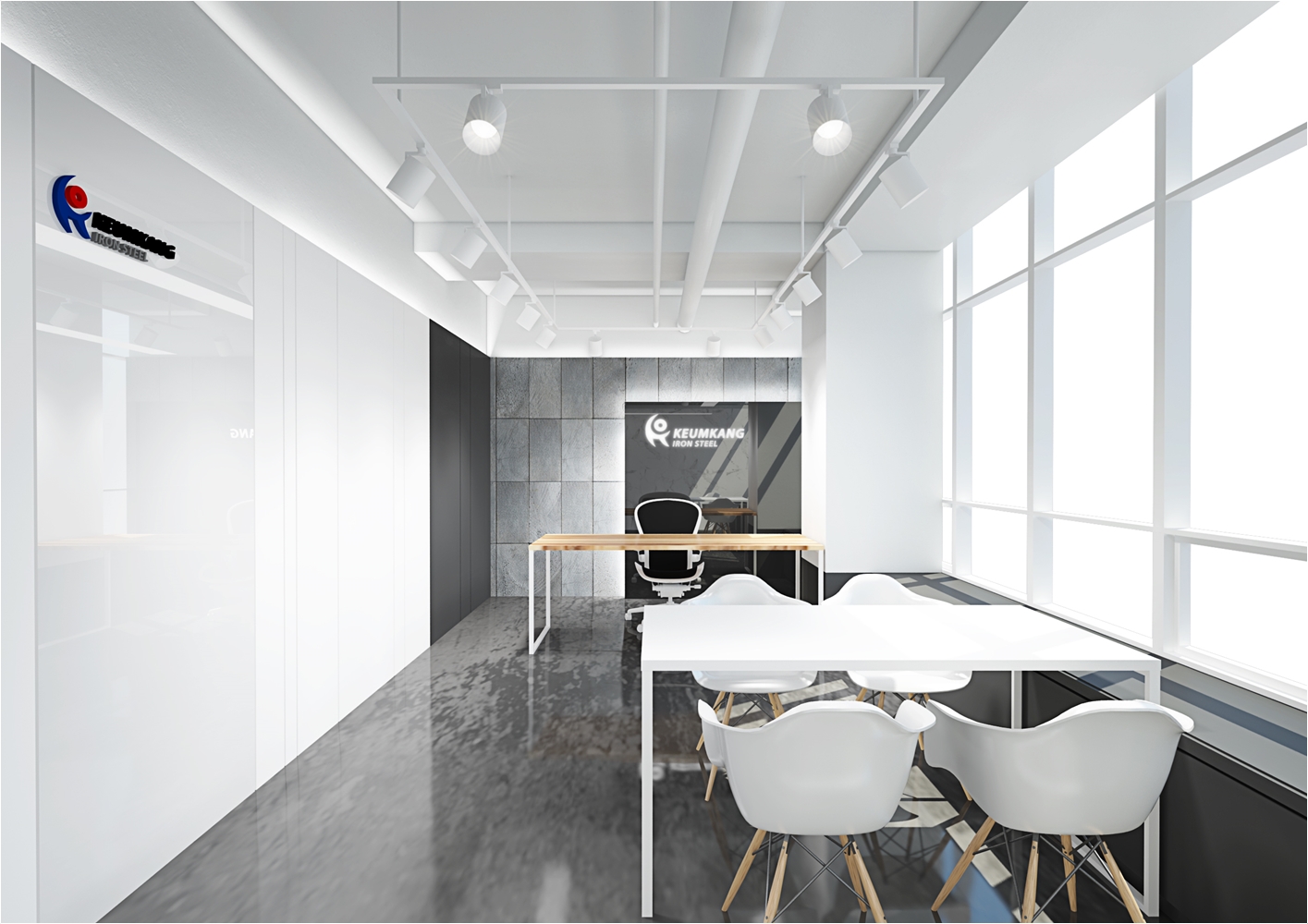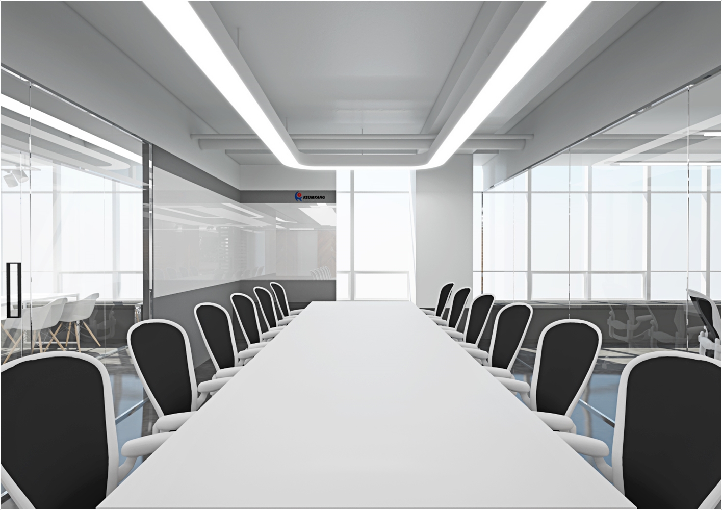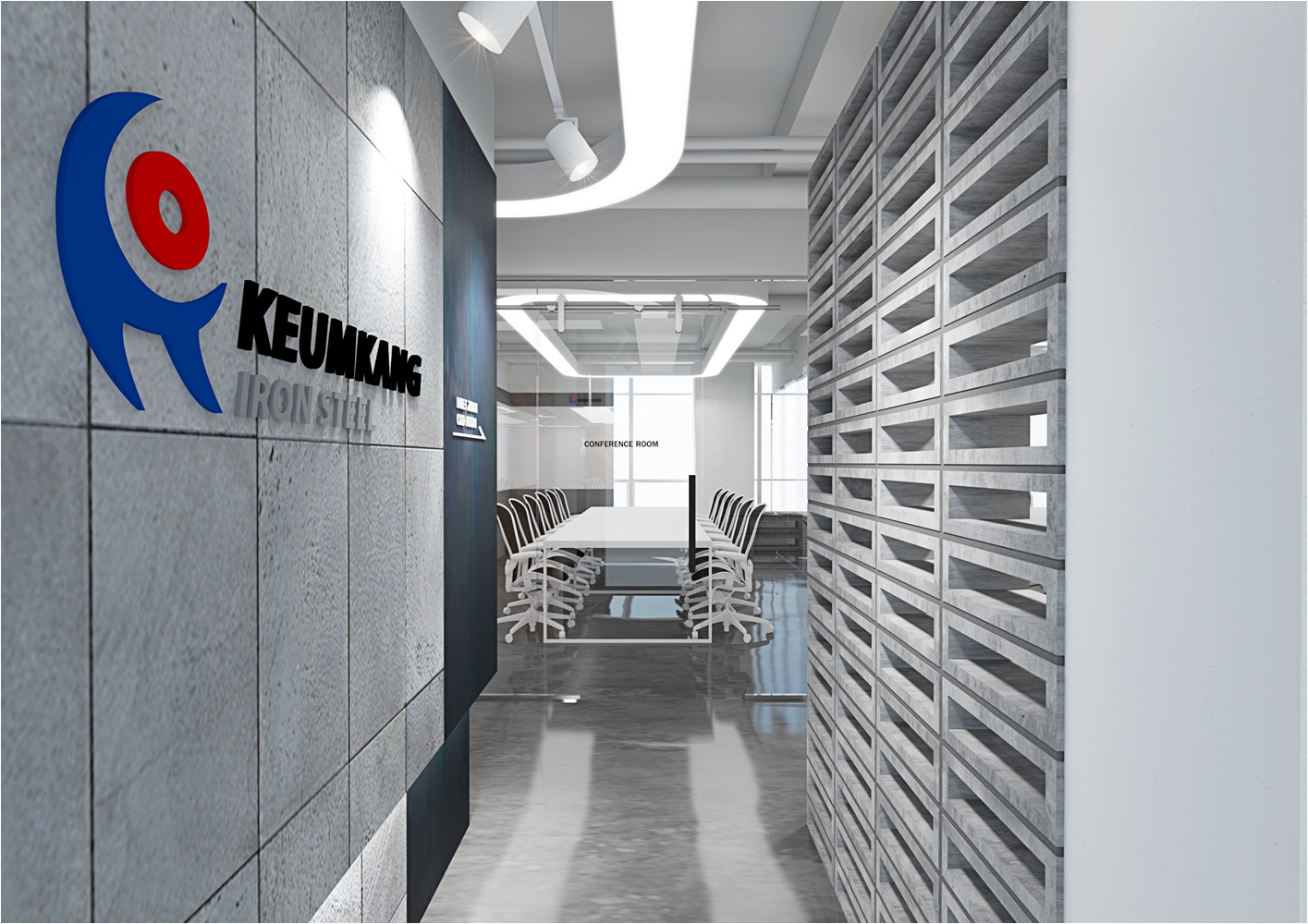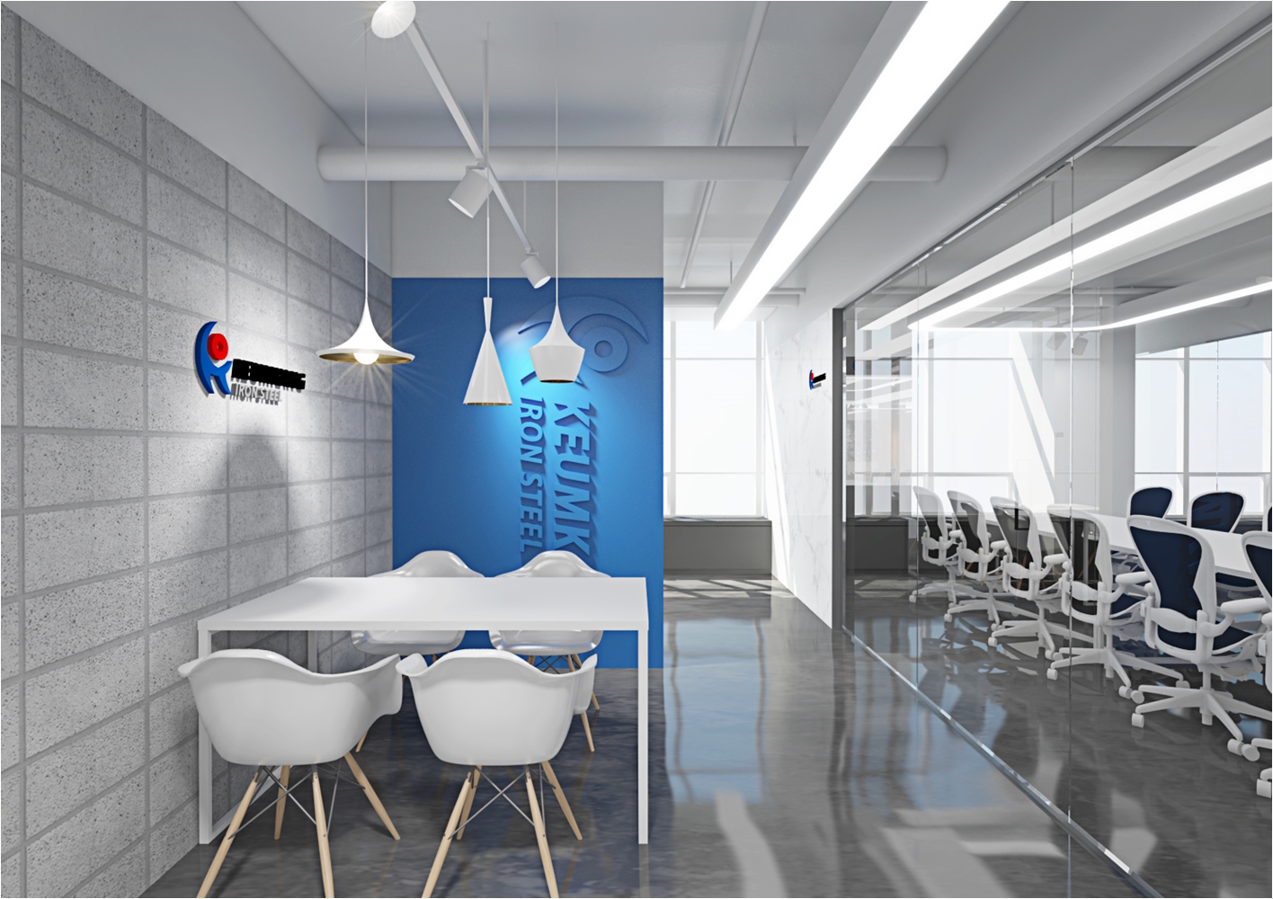다만 외관에서 보았을때 회의실의 공간의 가독성을 가질수 있게 구성을 하는게 좋겠죠 이 현장의 경우는 회사의 로고를 부착하여 회의실만의 포인트를 나타냈고 강화 유리마감으로 누구든지 회의공간의 모습을 체크하고 진행현황을 볼수 있도록 설계가 되었습니다. 실제 마감현장에는 유리 선팅마감으로 진행이 되었습니다.