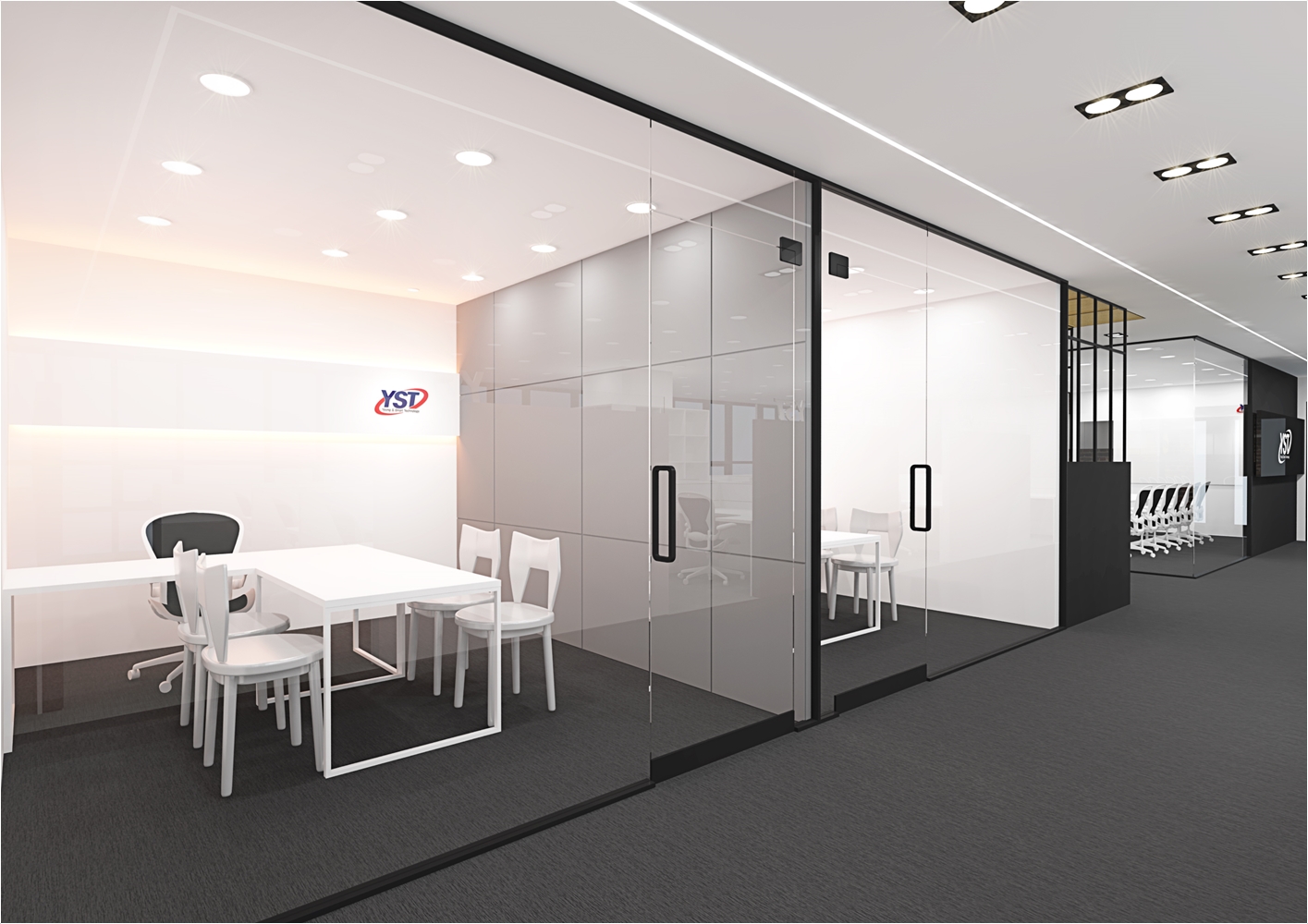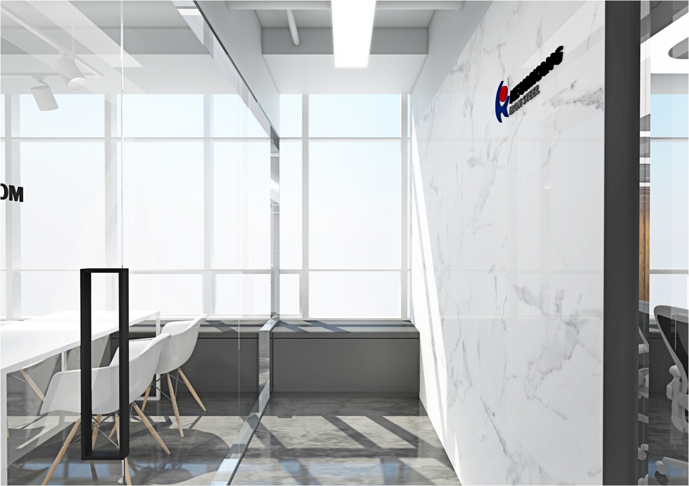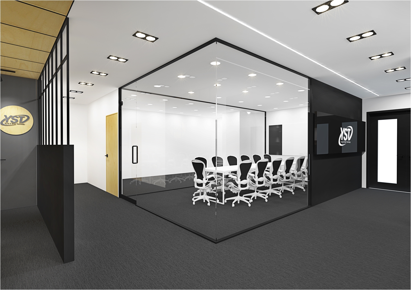 다만 외관에서 보았을때 회의실의 공간의 가독성을 가질수 있게 구성을 하는게 좋겠죠 이 현장의 경우는 회사의 로고를 부착하여 회의실만의 포인트를 나타냈고 강화 유리마감으로 누구든지 회의공간의 모습을 체크하고 진행현황을 볼수 있도록 설계가 되었습니다. 실제 마감현장에는 유리 선팅마감으로 진행이 되었습니다.