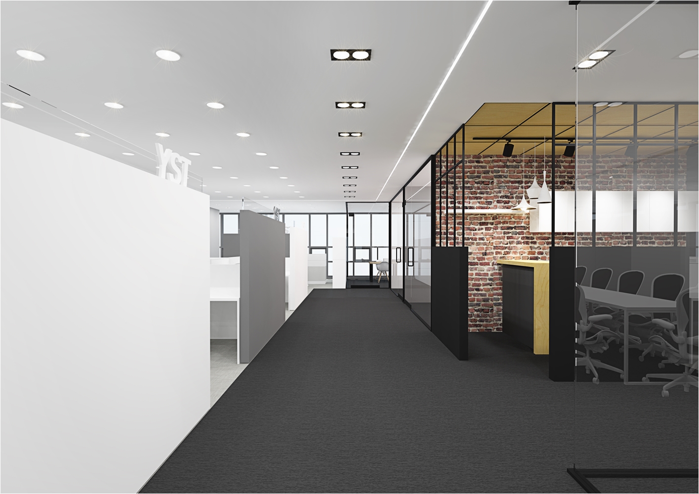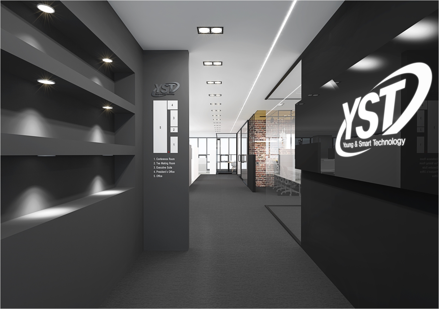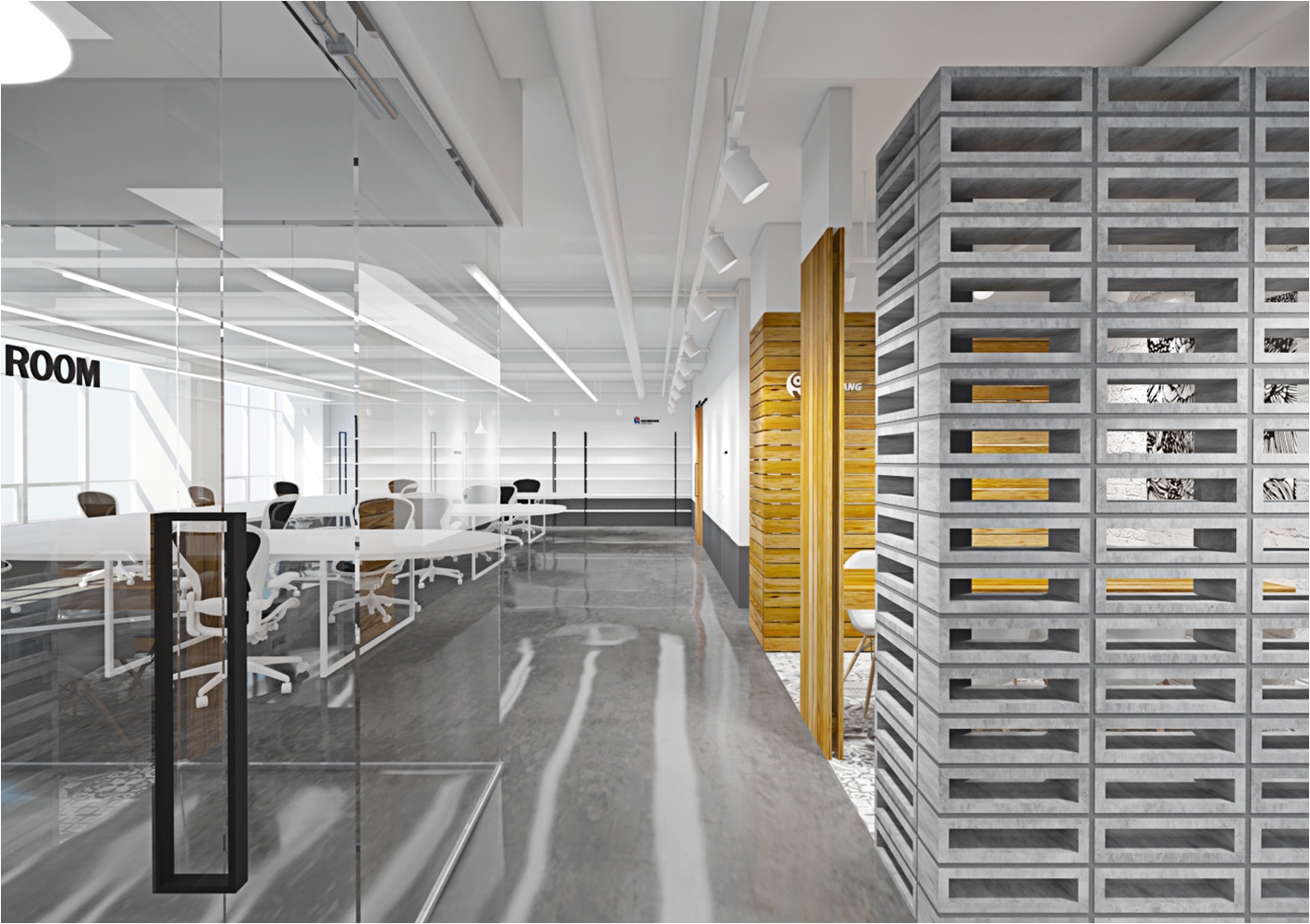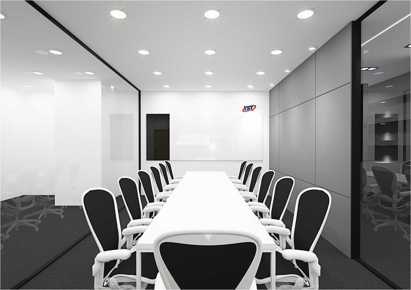 다만 외관에서 보았을때 회의실의 공간의 가독성을 가질수 있게 구성을 하는게 좋겠죠 이 현장의 경우는 회사의 로고를 부착하여 회의실만의 포인트를 나타냈고 강화 유리마감으로 누구든지 회의공간의 모습을 체크하고 진행현황을 볼수 있도록 설계가 되었습니다. 실제 마감현장에는 유리 선팅마감으로 진행이 되었습니다.